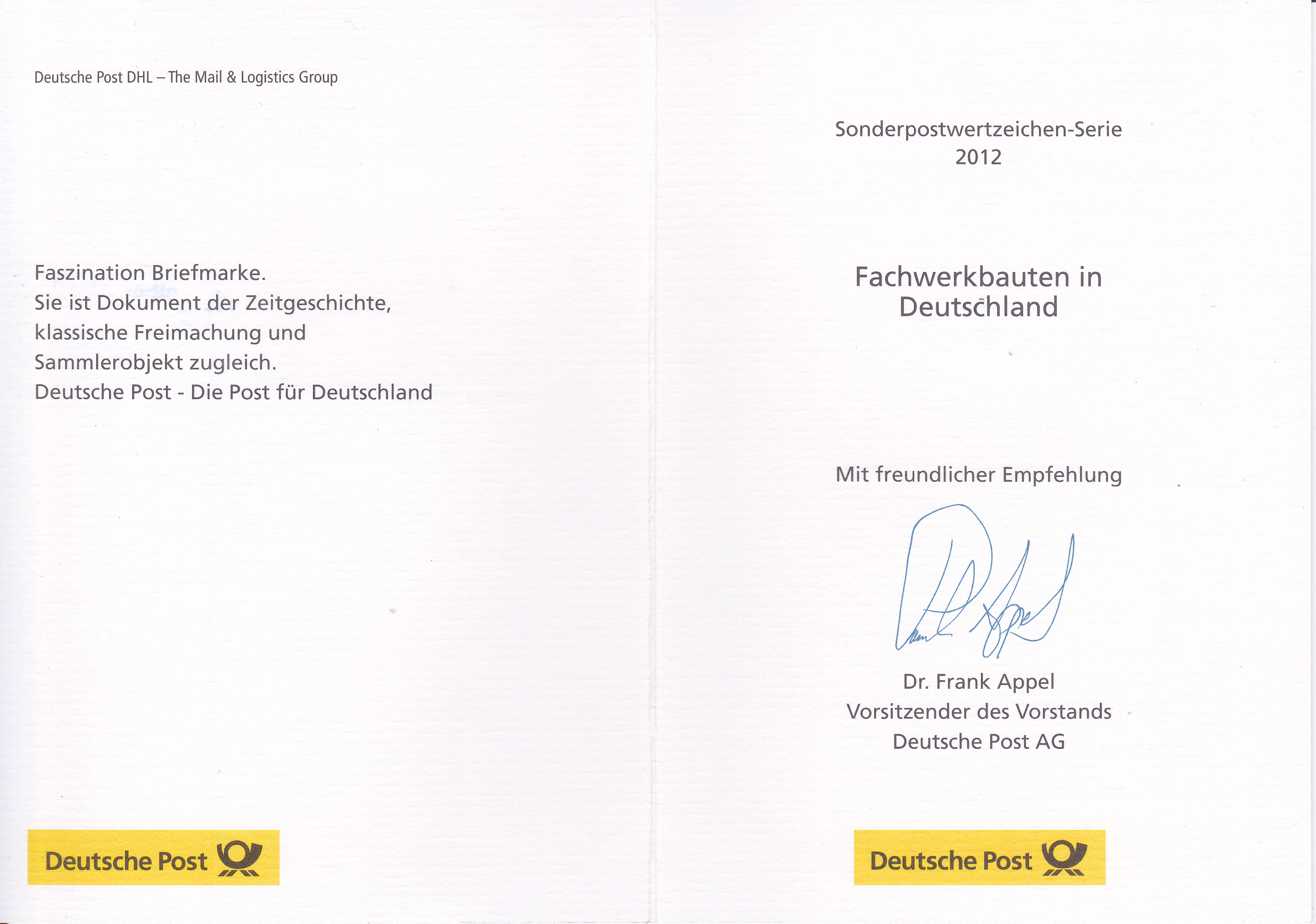 Klappkarte des Vorstandsvorsitzenden der Deutschen Post AG mit einer Marke (MiNr 2970) mit dem Motiv "Mitteldeutscher Fachwerkbau (16. Jh.), Dinkelsbühl" aus der Serie "Fachwerkbauten in Deutschland" und dem Ersttagsonderstempel Bonn.