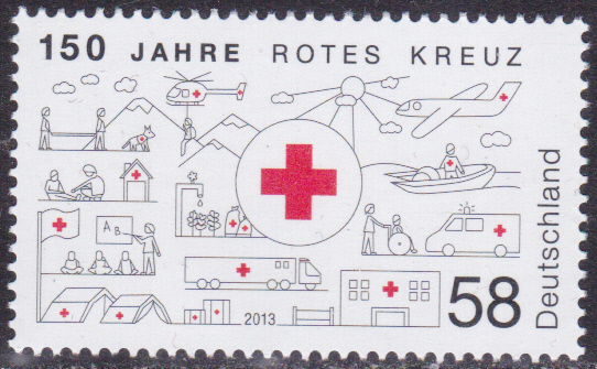 Bei der Deutschen Post ist 2013 diese Marke "150 Jahre Rotes Kreuz" (MiNr 2998) erschienen.