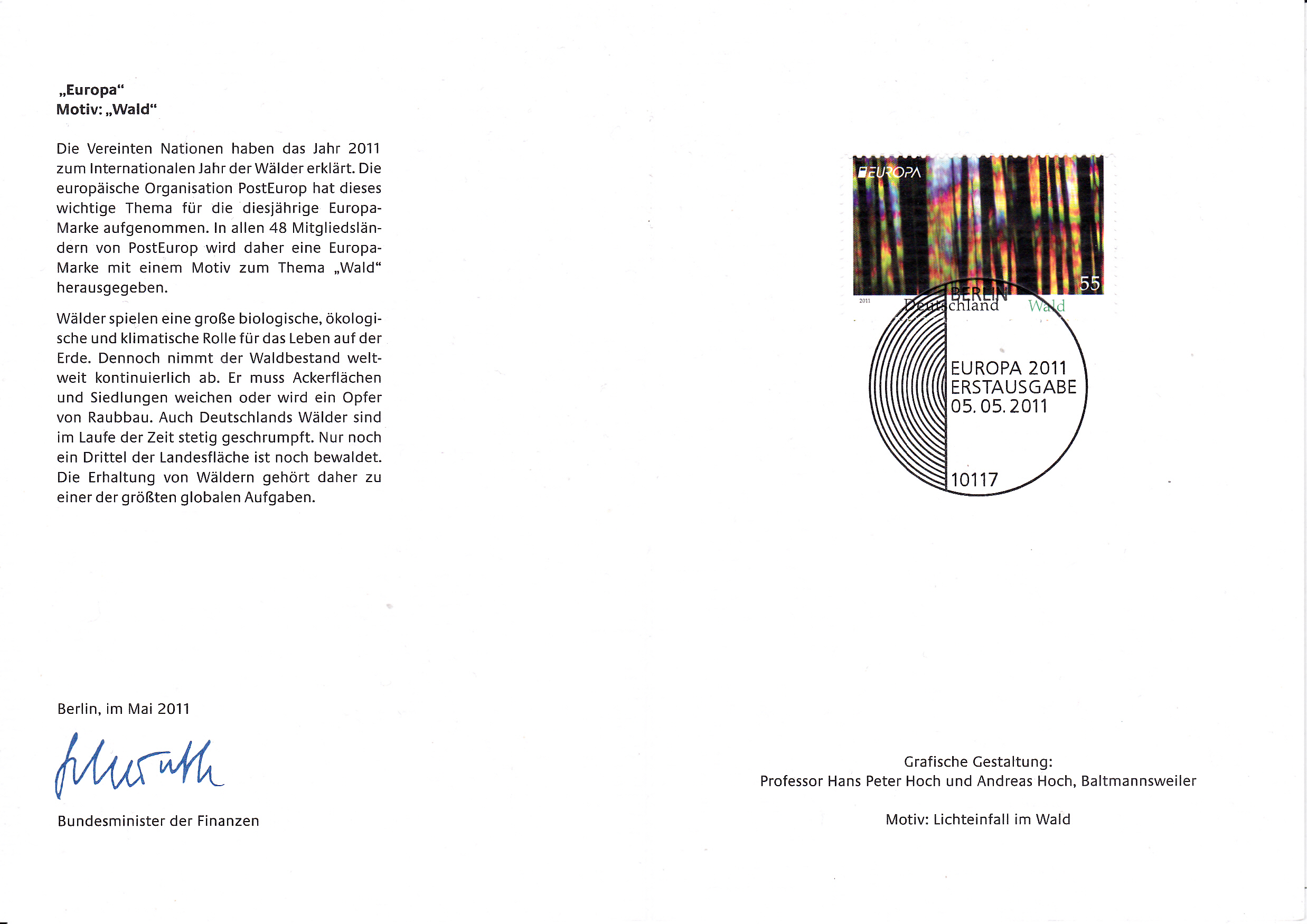 Ministerkarte des Bundesministers für Finanzen mit einer Marke "Europa 2011" (MiNr 2864) zum Gemeinschaftsthema "Der Wald" und dem Ersttagsonderstempel Berlin.