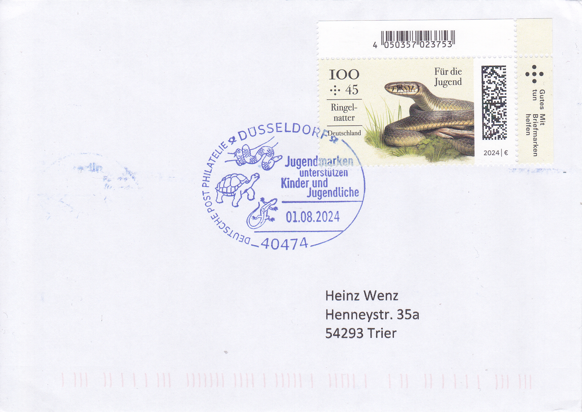 Am Ersttag der Marke fand in Düsseldorf im Aquazoo die offizielle Übergabe der Jugendmarken 2024 statt. Dazu wurde an einem Stand eines "Event-Teams" ein Sonderstempel mit einer Ringelnatter, eine Sumpfschildkröte und Smaragdeidechse geführt.