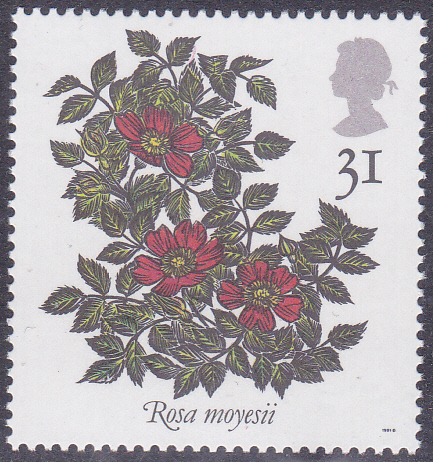 Auf dieser Marke (MiNr 1347) der Serie "Weltkongress für Rosenzucht in Belfast" ist eine Mandarin-Rose (Rosa moyesii) abgebildet.