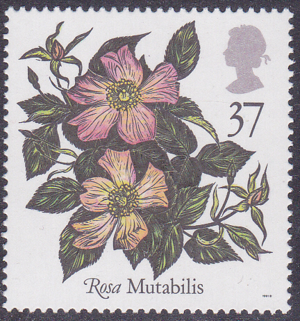 Diese Marke (MiNr 1349) mit einer Rose "Mutabilis" vervollständigt die Serie.