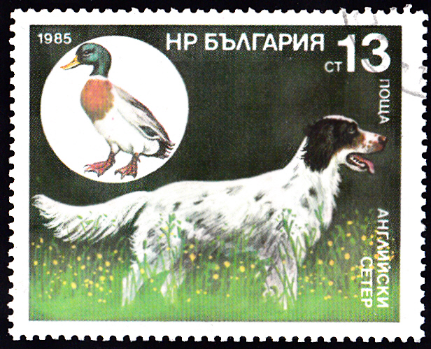 Diese Marke (MiNr 3431) aus einer Serie "Jagdhunde" zeigt neben einem English Setter auch eine Stockente (Anas platyrhynchos).