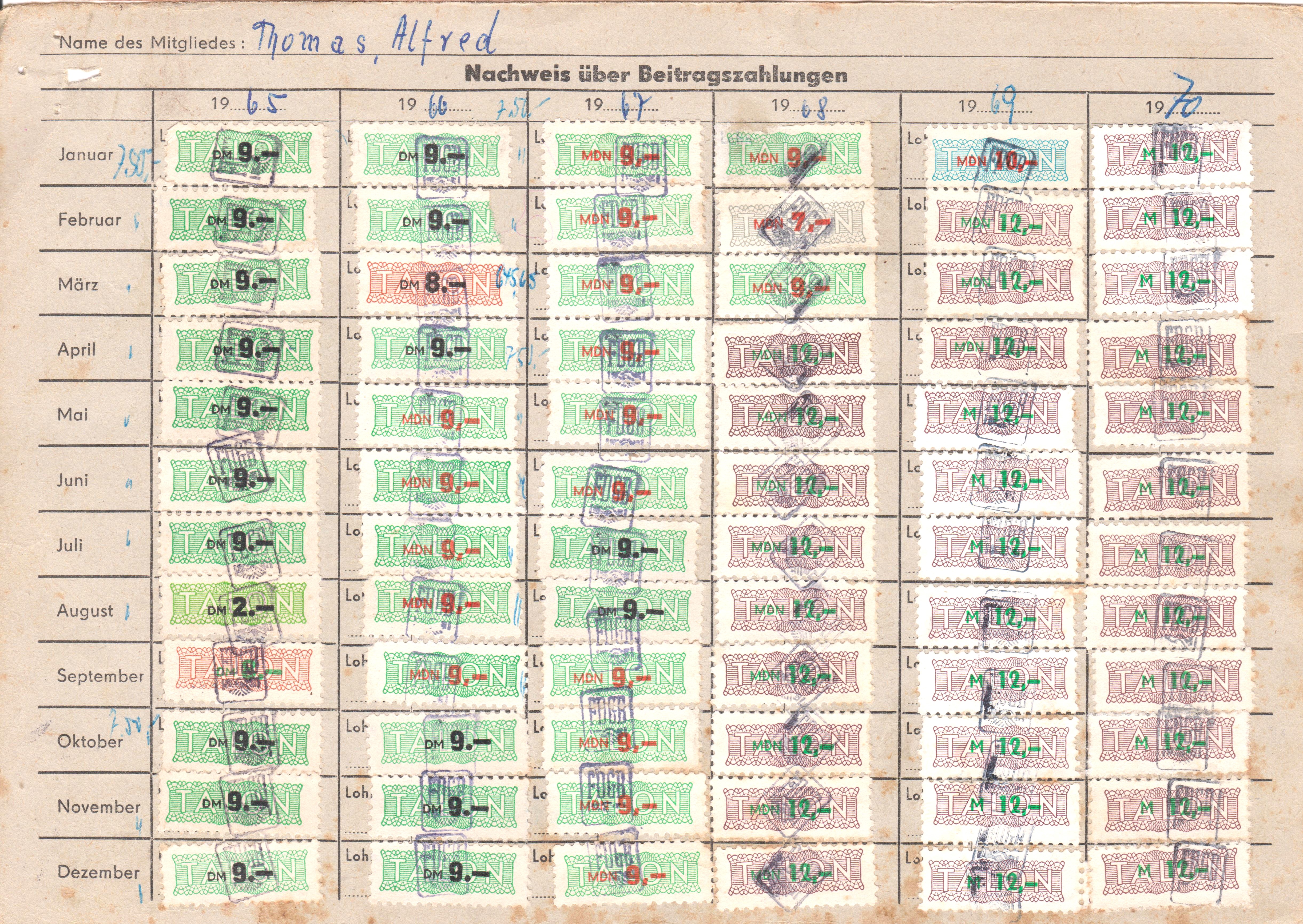 Diese Beitragsmarken wurden im FDGB-MITGLIEDSBUCH verklebt in der Rubrik "Solidaritätsmarke".