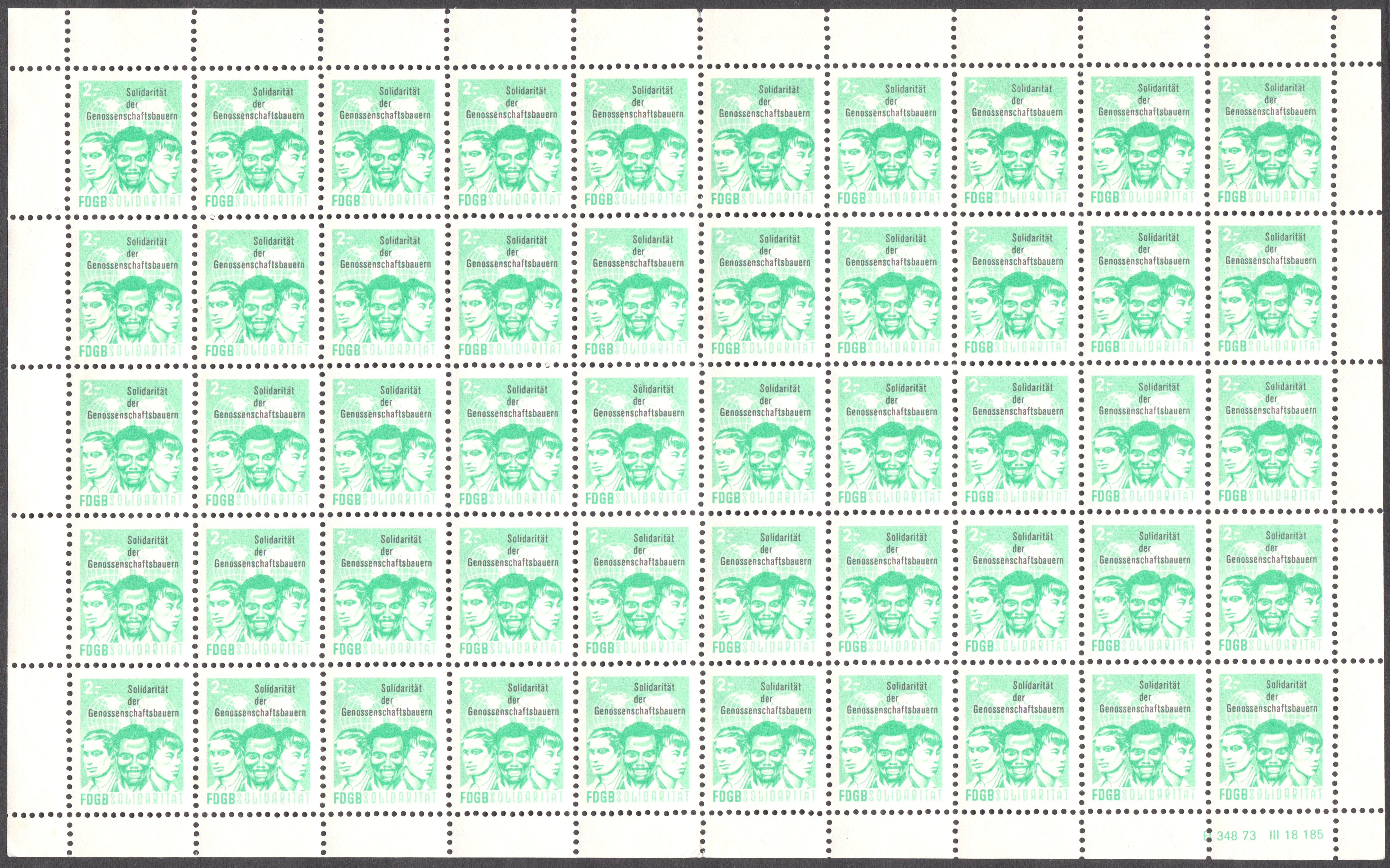 Originalbogen der Wertstufe 2,- mit Aufdruck "SOLIDARITÄT DER GENOSSENSCHAFTSBAUERN", Druckvermerk B 348 73 III 18 185: