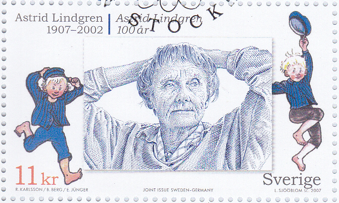 In einer Parallelausgabe "100. Geburtstag von Astrid Lindgren" sind bei der Deutschen Post und in Schweden diese beiden bildgleichen Marken erschienen.
