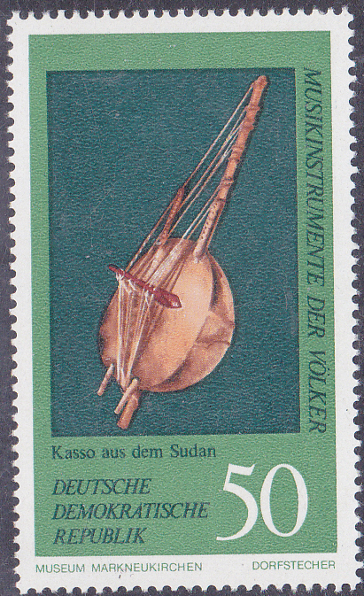 Auf einer Marke aus der DDR (MiNr 1713) ist ein Musikinstrument mit dem Namen "Kasso" abgebildet. Es gehört zur Kategorie der Harfen-Lauteninstrument und kommt aus dem Sudan.