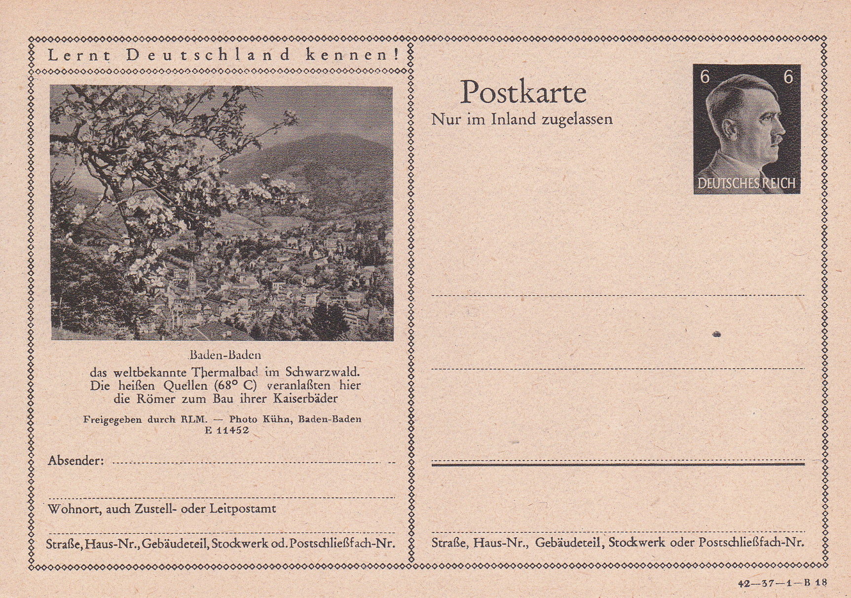 Auf der nächsten Karte (Serie 37 Bild 16) wiederholt Baden-Baden eine Luftaufnahme des Ortes aus dem Vorjahr.