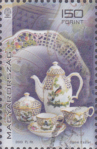 In Ungarn ist diese Marke (MiNr 4760) mit einem Durchbrochener Zierteller mit Blumendekor und einem Frankenthaler Kaffeeservice.