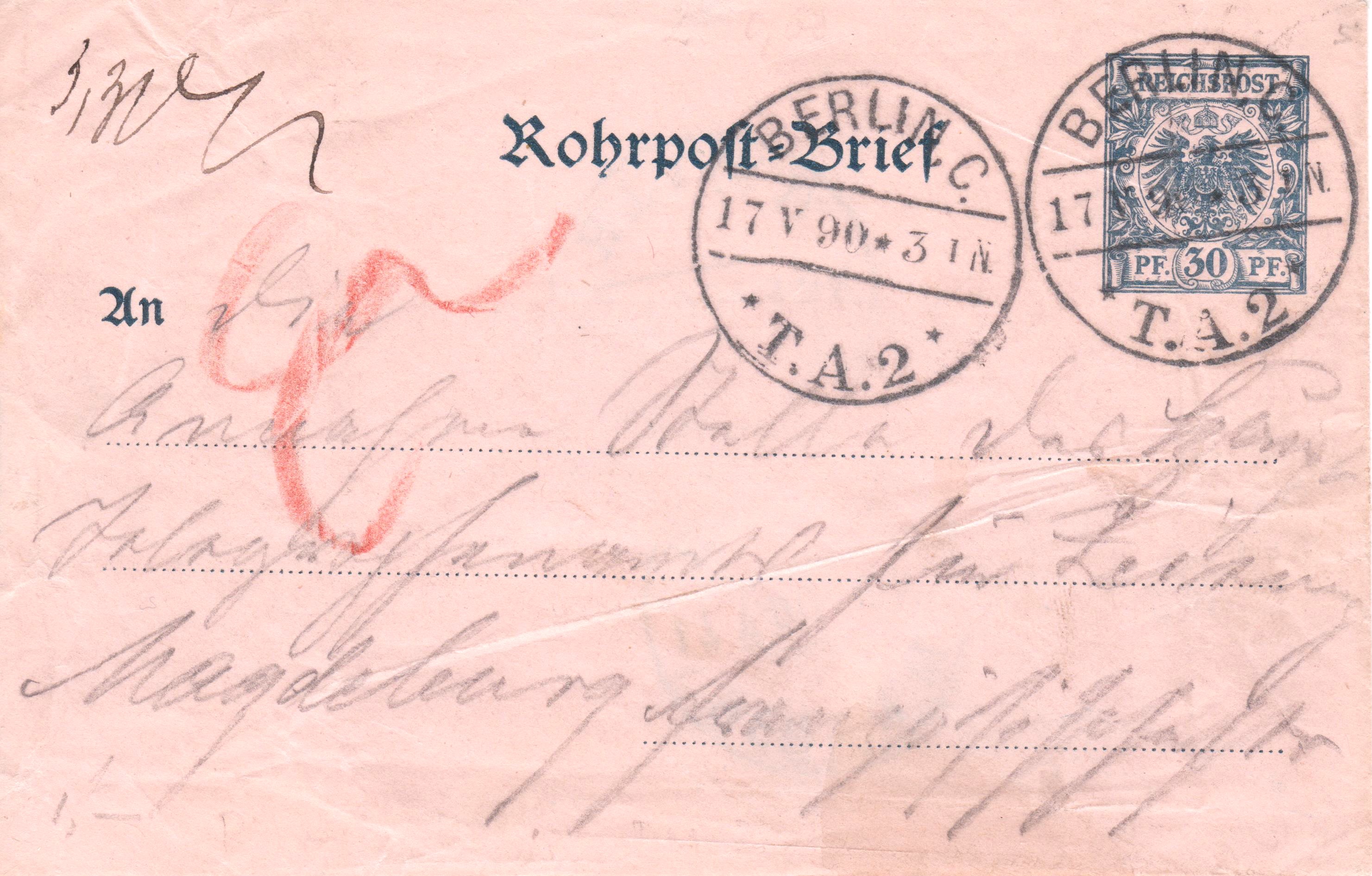 "Rohrpost=Brief", aufgegeben am 17.05.1890 in BERLIN, C. T. A. 2, handschriftlicher Leitvermerk in Rot "C", per Rohrpost befördert via BERLIN, W. H.T.A. (R 1):