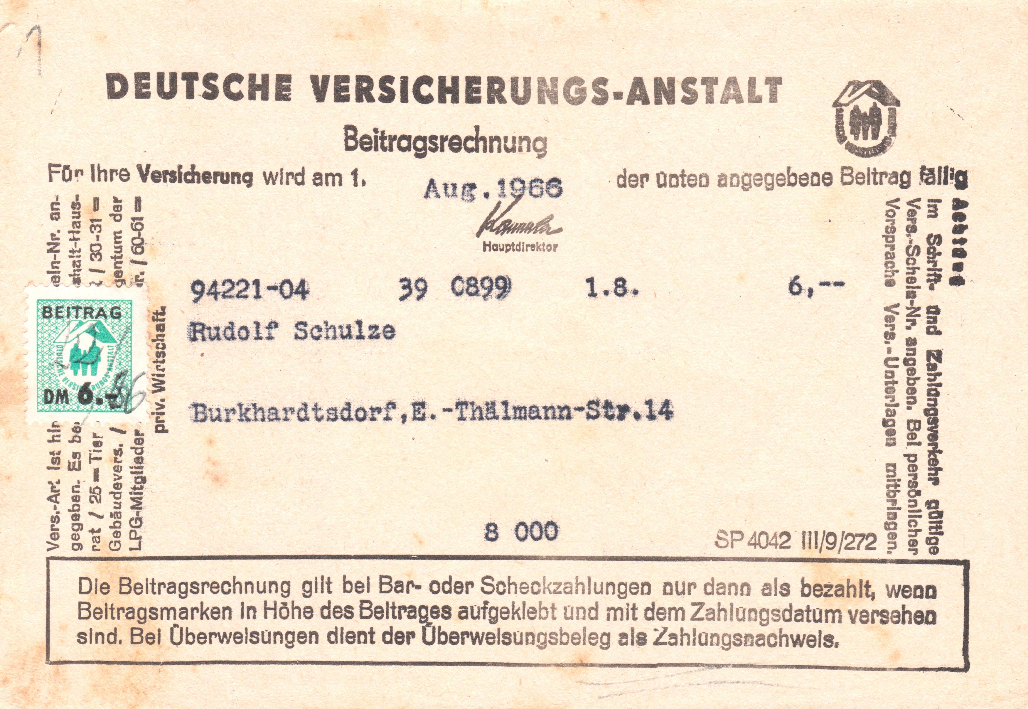 Beitragsrechnung von 1967 mit Beitragsmarke MDN 6.- :