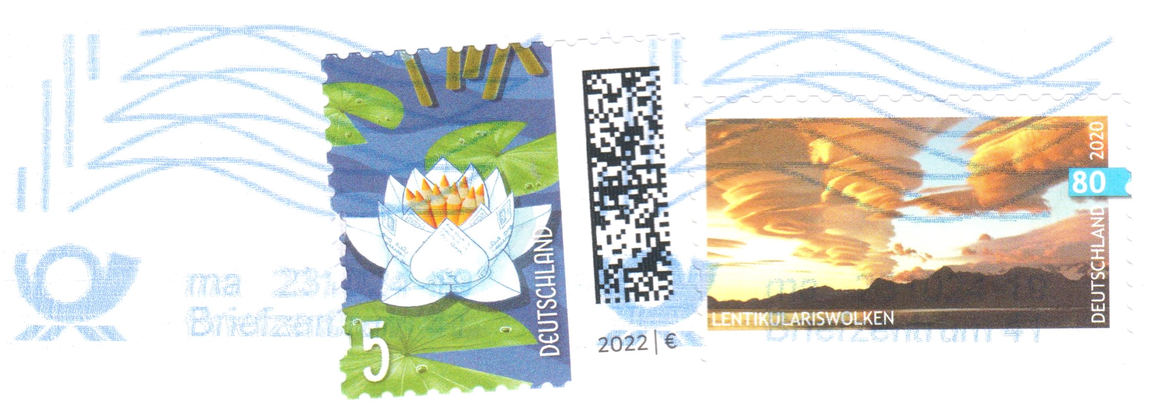 Lentikularwolken aus der Serie "Himmelserscheinungen" der Deutschen Post, MiNr. 3531, als Mischfrankatur auf Brief, Portostufe 0,85 €: