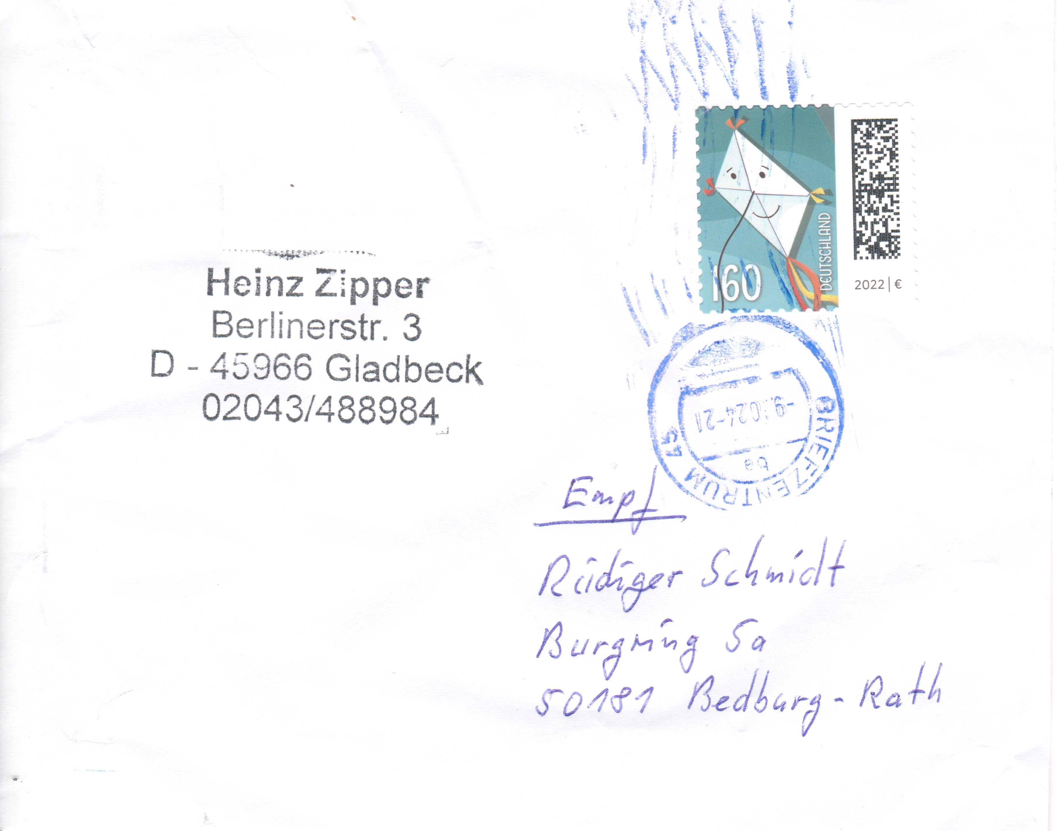 Einzelfrankatur am 09.10.2024 auf Brief ab BRIEFZENTRUM 45: