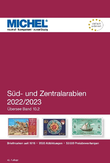 Am 4.11.2022 erschien der neue Michel Süd- und Zentralarabien 2017 (ÜK 10.2) in der 42. Auflage in Farbe mit 928 Seiten im Format 155 x 230 mm als Hardcover. Er kostet in Papierform als Katalog 98,00 € und als E-Book in der Online-Bibliothek: 69,00 €. Er enthält folgende Gebiete: Abu Dhabi, Aden, Ajman, Bahrain, Dubai, Fujeira, Jemen, Kuwait, Oman, Qatar, Ras al-Chaima, Saudi-Arabien, Sharjah, Umm al-Qaiwain und VAE.