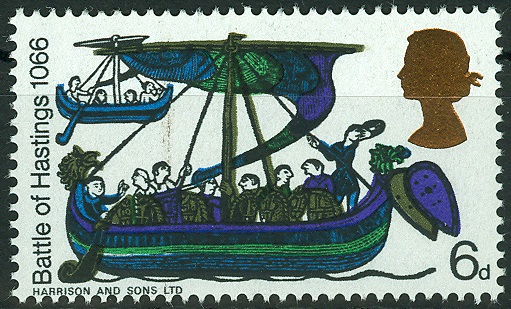 Durch den Sieg Wilhelm des Eroberers am 14.Oktober 1066 kam England unter normannische Herrschaft.1966, 900 Jahre später, brachte England eine Markenserie mit der bildlichen Darstellung der Invasion der Normannen heraus, die diesem Ereignis gewidmet war. Gedruckt nach den Motiven des berühmten Teppichs von Bayeux. Dort sieht man auf weißem Untergrund (lose gewebtes Leinen) Szenen, die mit farbiger Stickerei aneinandergereiht, eine fortlaufende Schilderung ergeben.