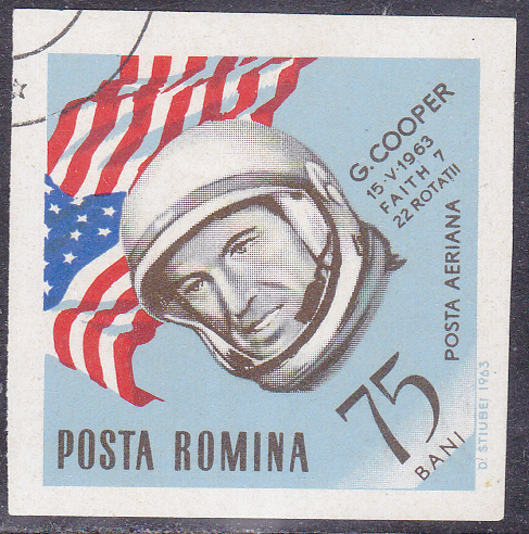 Die hier schon vorher gezeigte Marke aus Rumänien (MiNr 2245) mit dem Porträt von Gordon Cooper. wurde auch als geschnittene Marke (MiNr 2255) in etwas anderen Farben verausgabt.