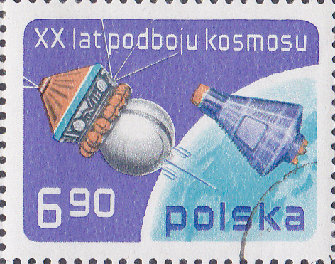 Auf dieser Marke aus Polen (MiNr 2539) zum Thema "20 Jahre Eroberung des Kosmos" sehen wir auf der linken Seite ein Wostok-Raumschiff und auf der rechten Seite eine Mercury-Kapsel.