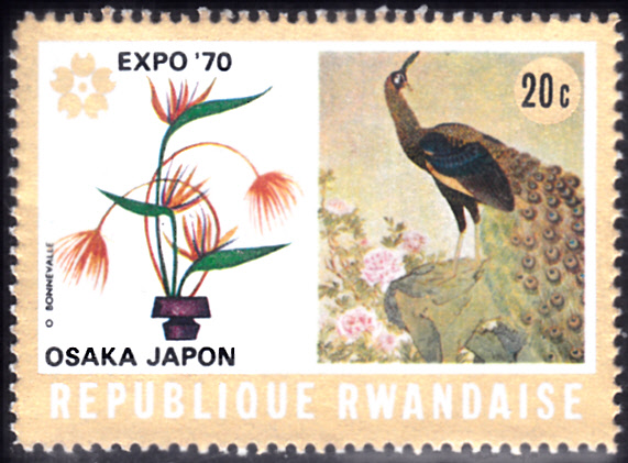 In einer Serien zur Expo'70 i9n Osaka ist in Ruanda diese Marke (MiNr 392 A) erschienen. Sie zeigt ein Blumenarrangement und einen Pfau.