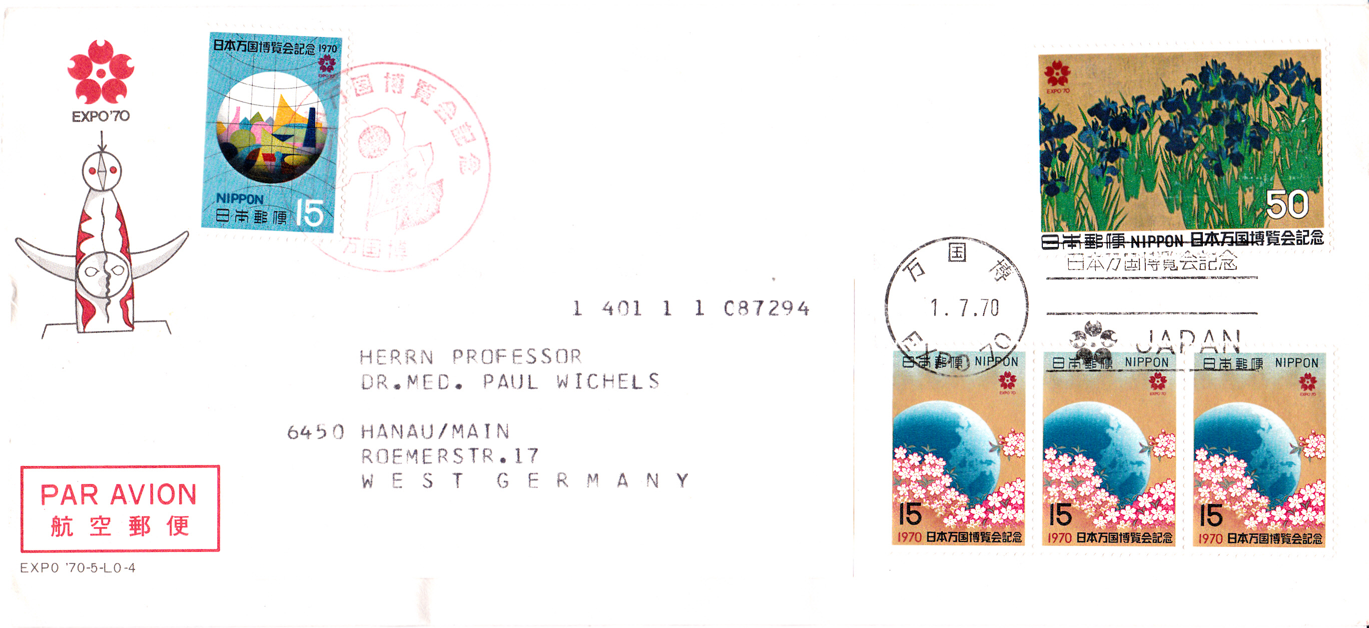Dieser Brief mit Luftpost von Osaka (Absender ist lt. rückseitiger Absenderangabe die Firma Nippon C. H. Boehringer Sohn Co., LTD. in Osaka) wurden mit drei Marken zu je 15 Yen (MiNr 1071 A), einer Marke zu 50 Yen (MiNr 1072 A) und einer Marke zu 15 Yen (MiNr 1077 A) frankiert. Eine Marke wurde mit einem roten Sonderstempel zur Expo 10 und die restlichen mit einem Maschinenwerbestempel ebenfalls zur Expo gestempelt.