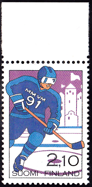 Dazu ist in Finnland diese Marke (MiNr 1130) mit einem Eishockeyspieler vor der Burg von Turku erschienen.