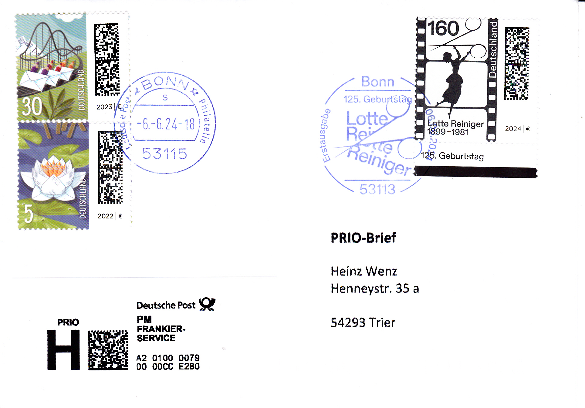 Prio-Brief vom Ersttag mit dieser Marke und dem Ersttagsonderstempel aus Bonn. Die Zusatzfrankatur wurde mit einem Tagesstempel entwertet.