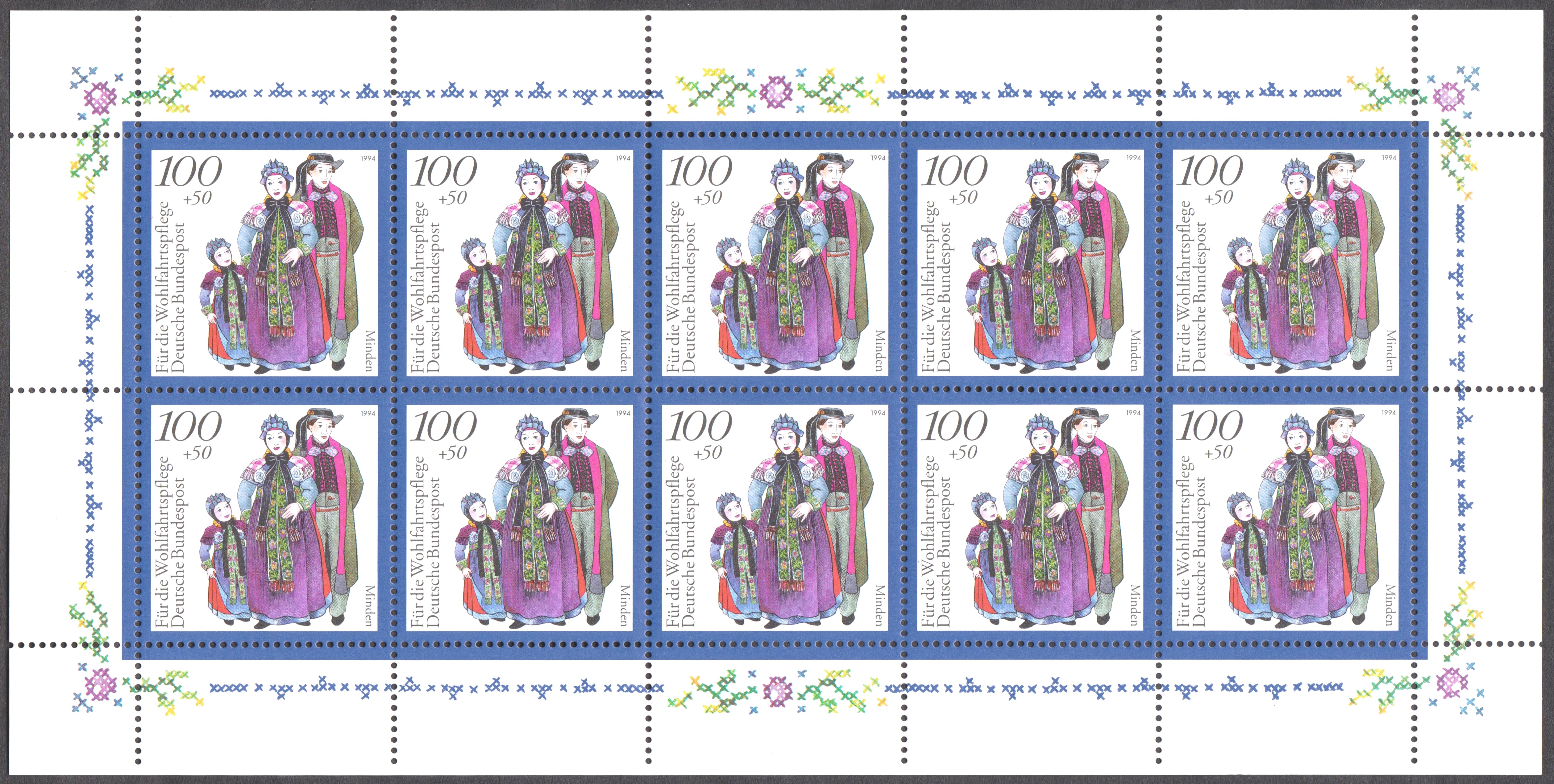 Bund MiNr. 1759 erschien am 13.10.1994 im Kleinbogen 5 x 2 und zeigt die Tracht von Minden: