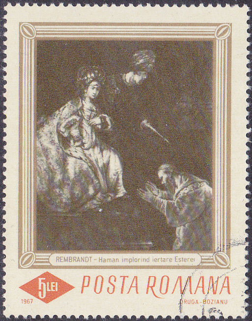 Auf dieser Marke aus Rumänien (MiNr 2581) wird das Gemälde "Haman fleht um Vergebung bei Esther" von Rembrandt gezeigt.