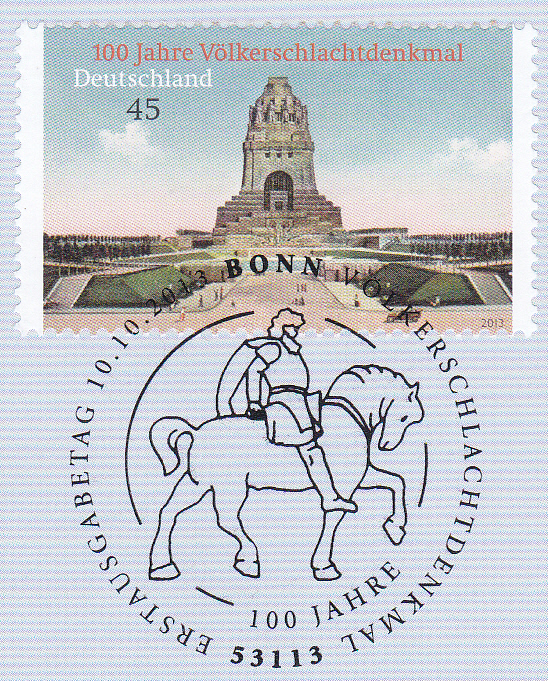 Zum Jubiläum "100 Jahre Völkerschlachtdenkmal in Leipzig ist diese Marke (MiNr 3033) mit dem Völkerschlachtdenkmal nach Entwürfen von Bruno Schmitz erbaut von Christian Behrens (1852-1905) und Franz Metzner (1870-1919).