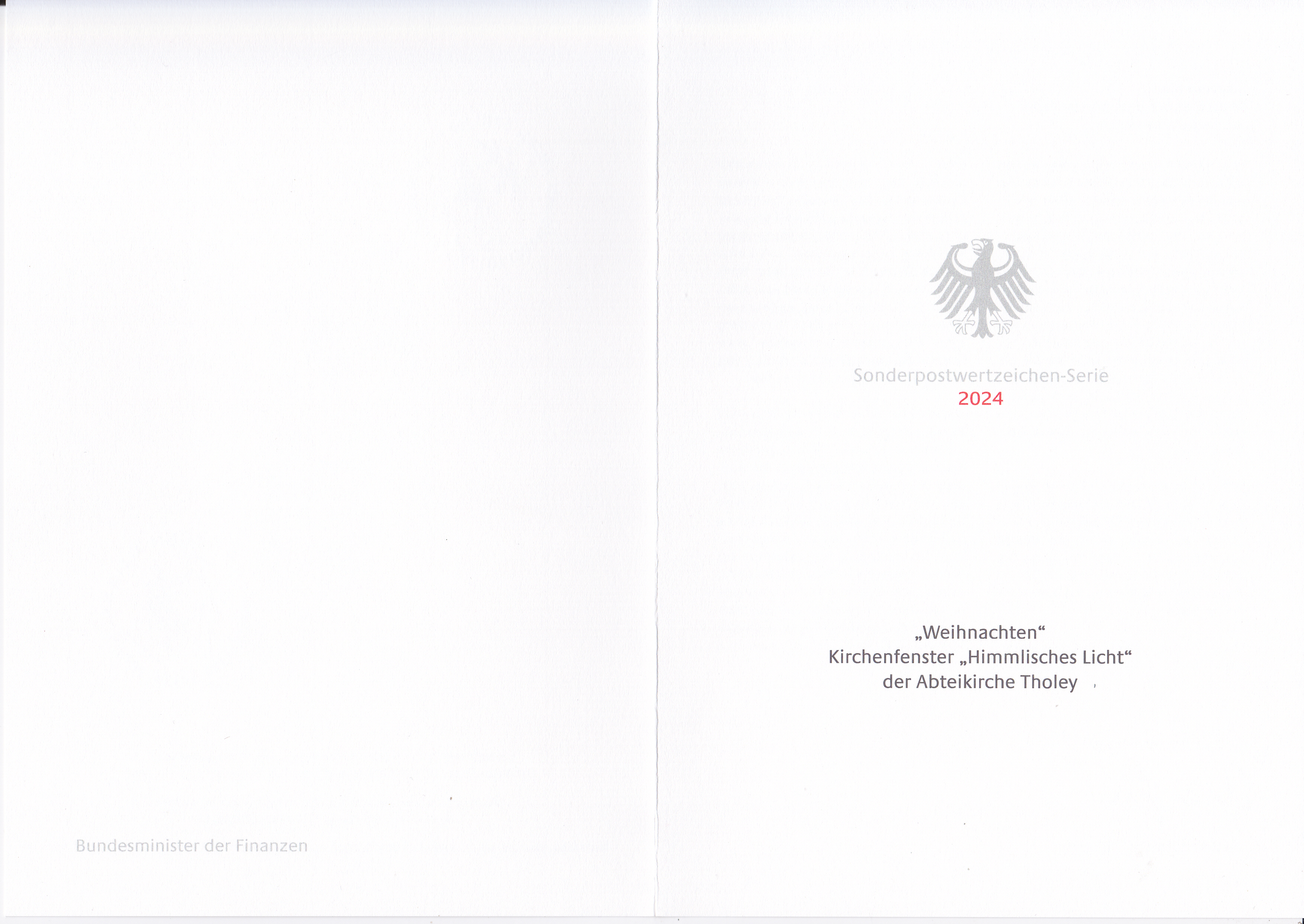 Weiße Ministerkarte des Bundesministers für Finanzen mit zwei Weihnachtsmarken (MiNr 3862) mit dem Motiv "Himmlisches Licht" nach einem Detail eines Kirchenfensters der Abteikirche Tholey von Mahbuba Elham Maqsoodi und den beiden Ersttagsonderstempel Bonn und Berlin.