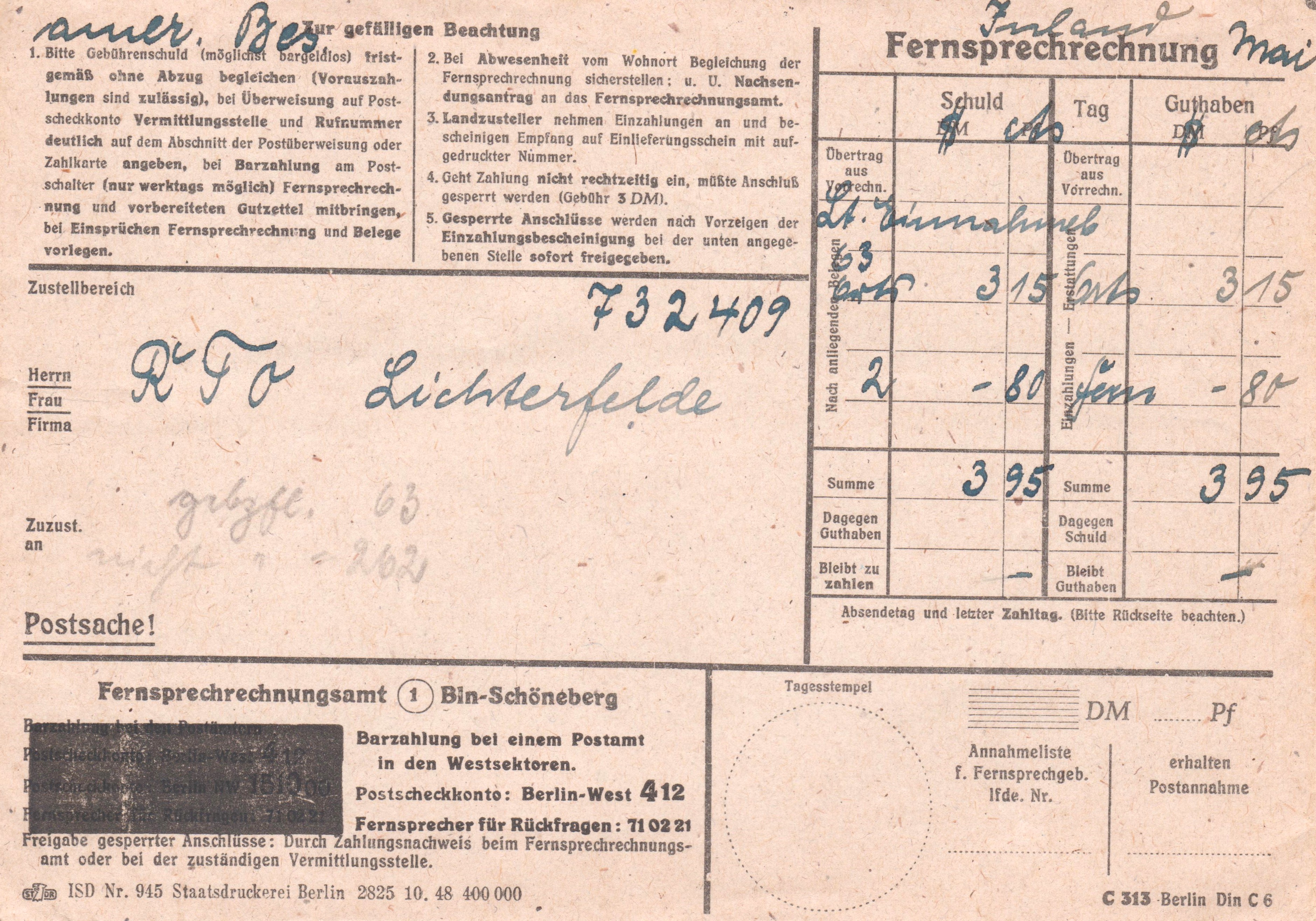 Vorgedruckter Umschlag "Fernsprechrechnung" vom Mai 1952 für den Telefonanschluß "732409" in Lichterfelde: