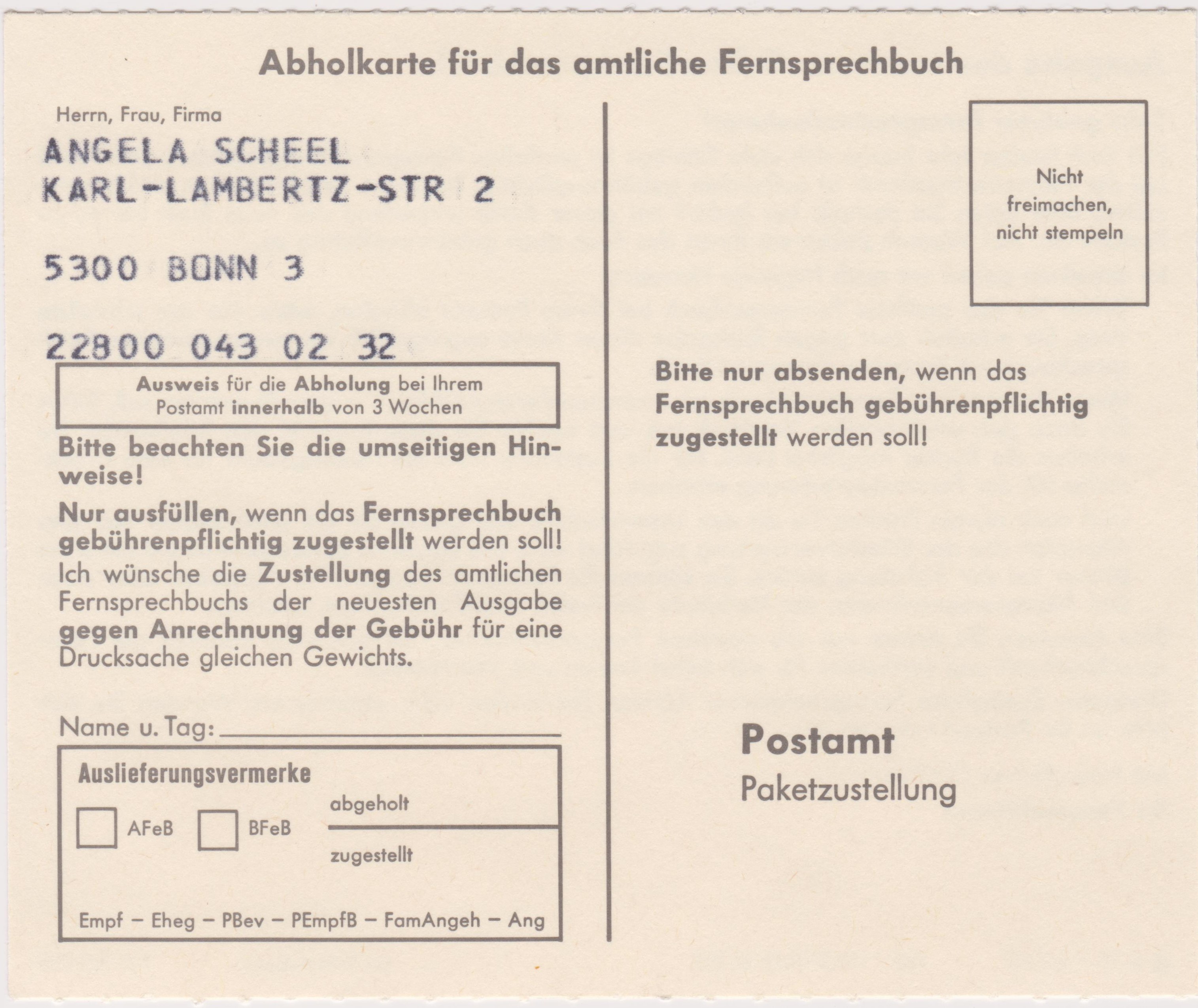 Heute kann ich Euch diese "Abholkarte für das amtliche Fernsprechbuch" zeigen, die ich als Lesezeichen in einem Buch in einem öffentlichen Bücherschrank gefunden habe: