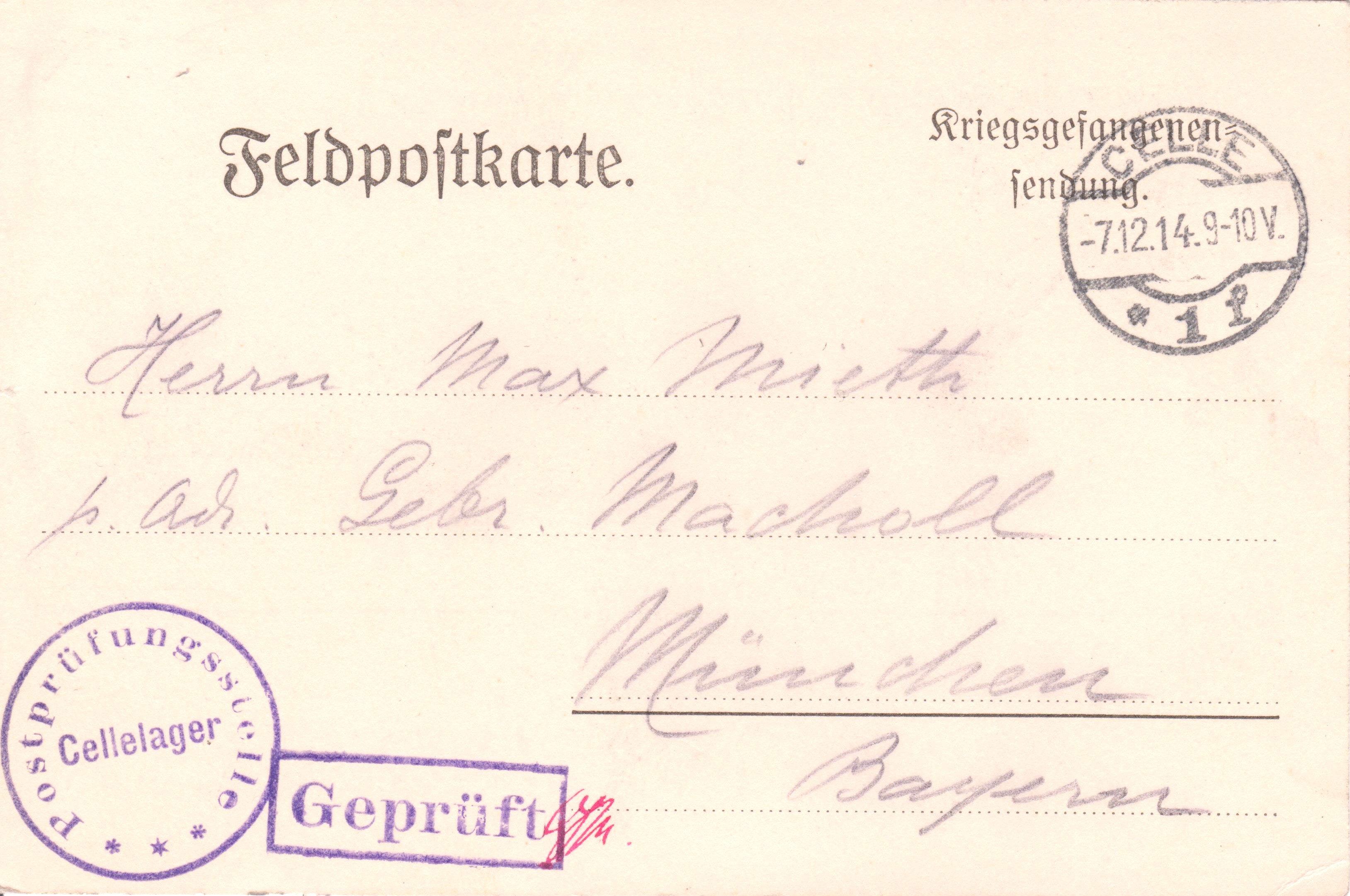 Diese nach München adressierte Kriegsgefangensensendung wurde in Cellelager aufgegeben, wo vorderseitig links unten ein Stempel "Postprüfungsstelle Cellelager" und rechts daneben ein Rahmenstempel "Geprüft" abgeschlagen wurde, ws ein handschriftlicher Prüfervermerk in Rot dokumentiert.