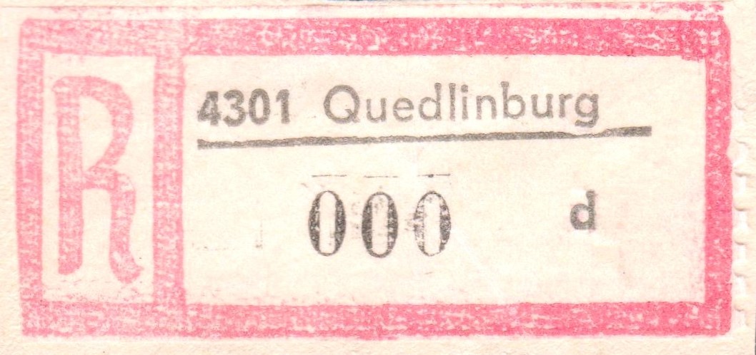 Einschreibzettel aus 4301 Quedlinburg, gedruckt auf Pergamin-Papier: