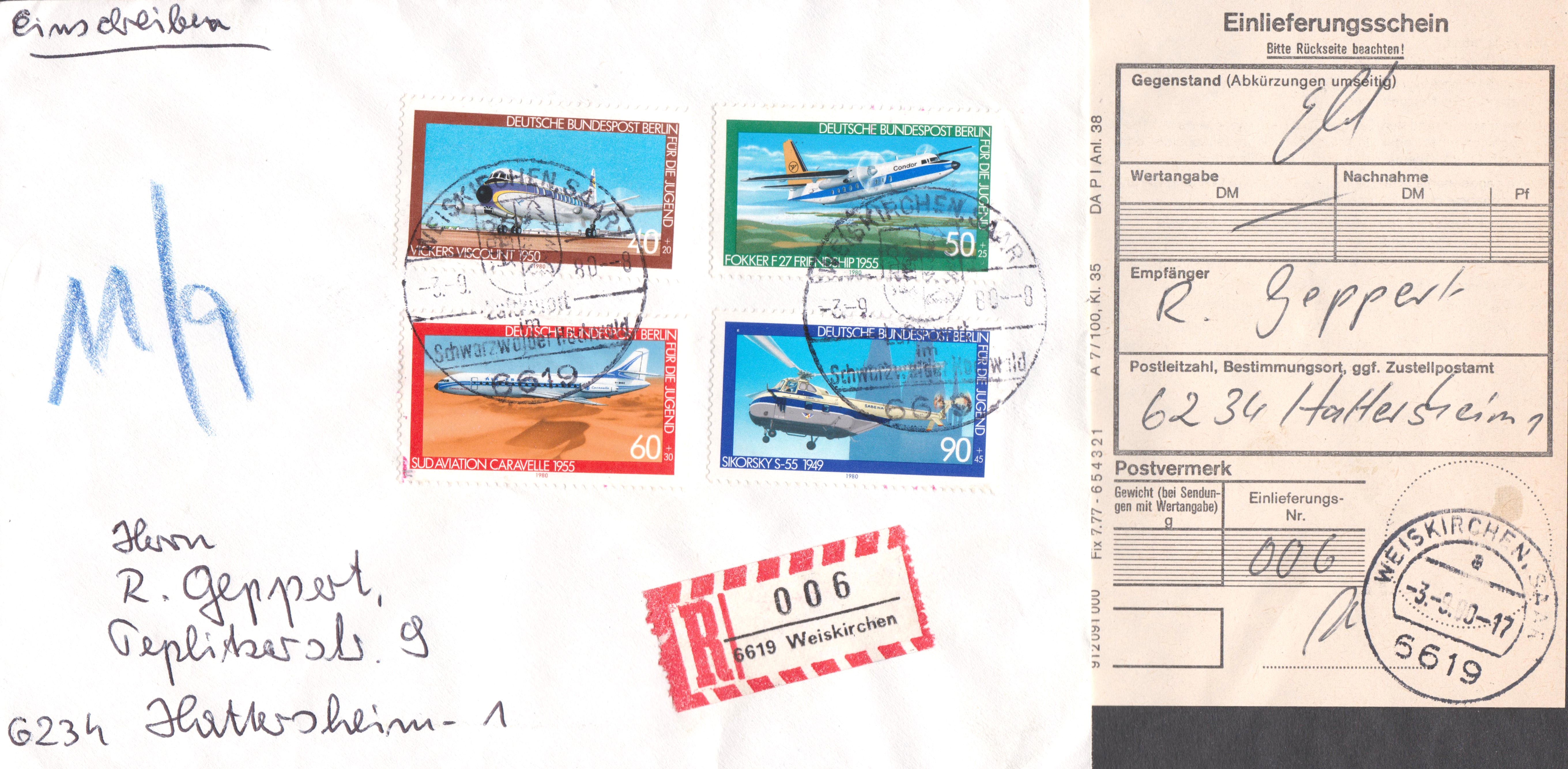 Satzbrief, frankiert mit Berlin MiNr. 617 bis 620, am 03.09.1980 per Einschreiben gelaufen von 6619 WEISKIRCHEN nach 6234 Hattersheim sowie der dazugehörige Einlieferungsschein: