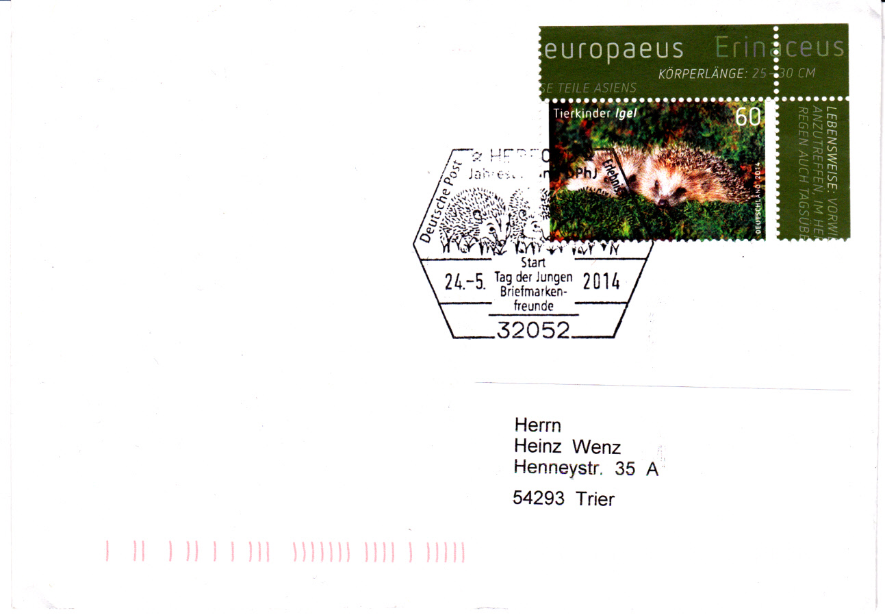 Am 2.1.2014 verausgabte die Deutsche Post in der Serie mit Tierbabies einen Wert zu 60 Cent mit Braunbrustigelkindern. Auf diesem Brief ist eine Marke in der selbstklebenden Form aus einem Folienbogen (MiNr. 3054) verklebt und mit dem Sonderstempel aus Herford zur Jahrestagung der DPhJ mit Abbildung von drei Igelkindern abgestempelt.
