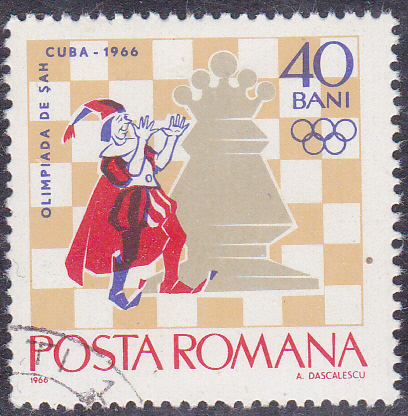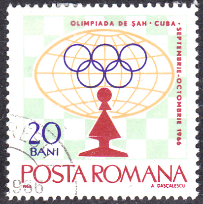 Aus einer Serie zur Schacholympiade 1966 in Havanna stammt diese Marke aus Rumänien (MiNr 2478) mit einer Weltkugel, den olympischen Ringe und einem Bauer vor einem Schachbrett.
