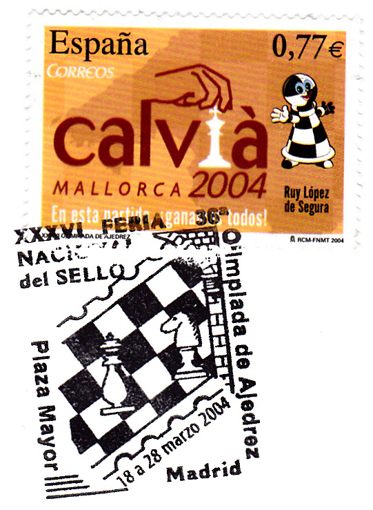 Am 18.3.2004 erschien in Spanien eine Sondermarke (MiNr 3936) zur 36. Schacholympiade. Hier eine Marke mit einem Ersttagsonderstempel aus Calvia. Im Markenbild ist eine Abbildung "Hand zieht König" und das Maskottchen "Peonín" zu sehen, im Stempelbild das Maskottchen vor einem Schachbrett.
