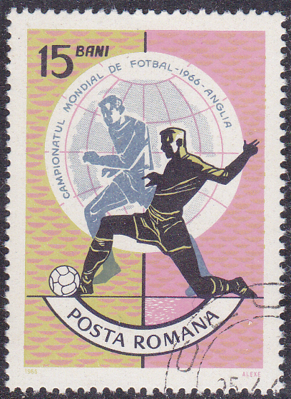 Aus einer Serie zur WM 1966 aus Rumänien kommt diese Marke (MiNr 2493) mit Spieler bei einem Kopfballduell.
