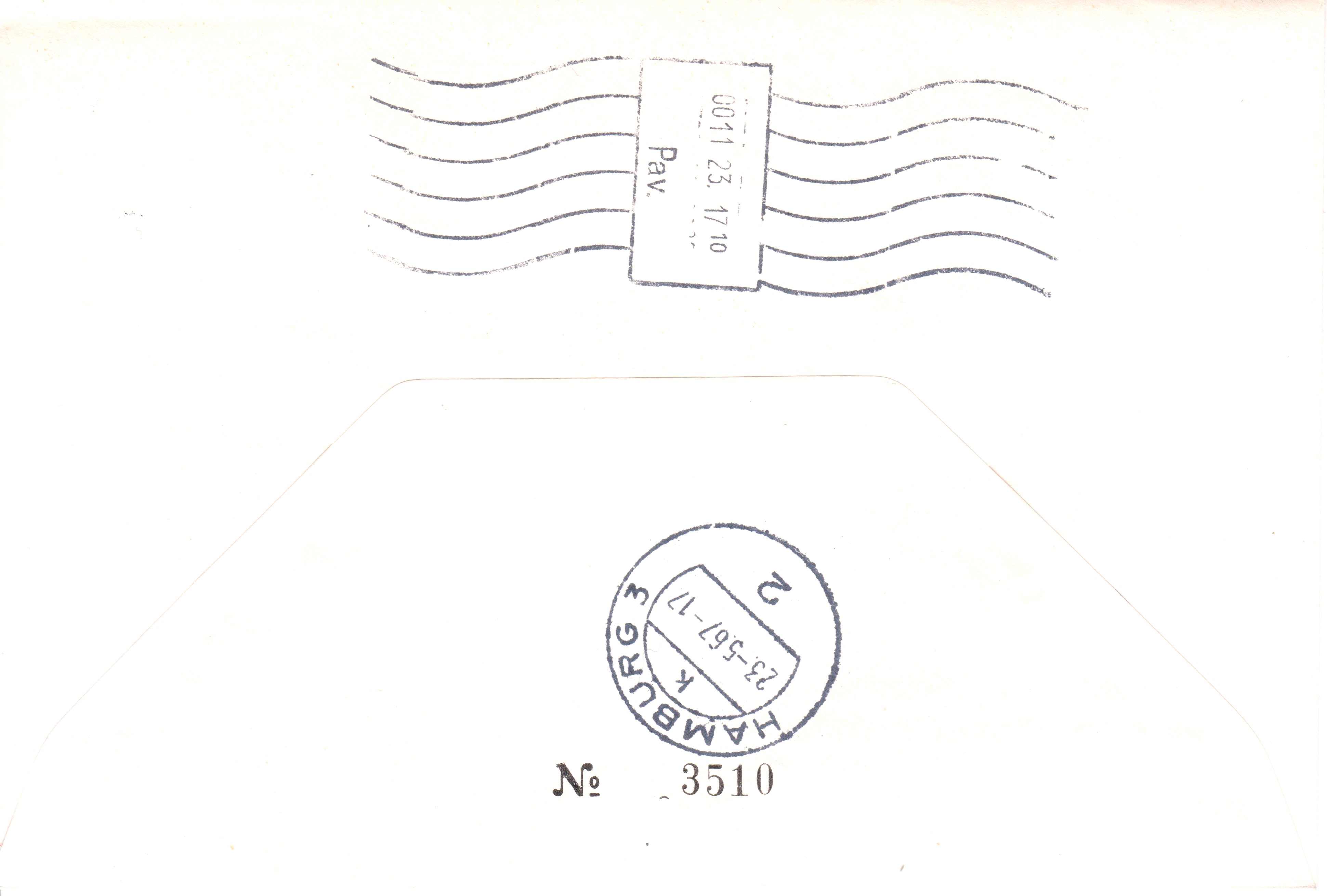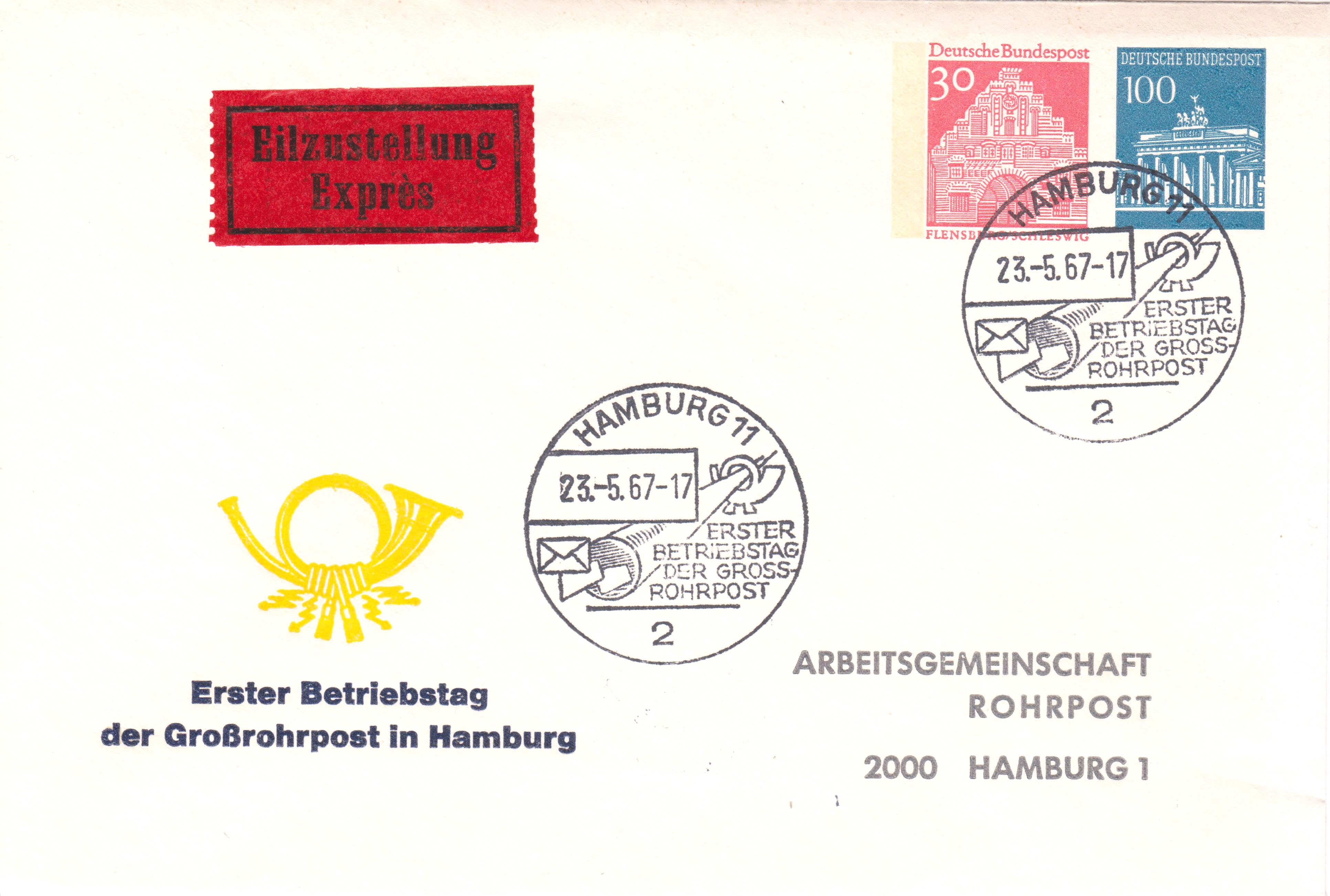 Dieser Beleg vom 23.05.1967 dokumentiert das Ereignis "Erster Betriebstag der Großrohrpost in Hamburg":