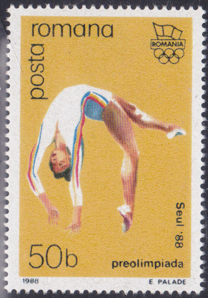 Eine Marke aus Rumänien (MiNr 4458) zu den Sommerspielen 1988 zeigt eine Bodenturnerin.