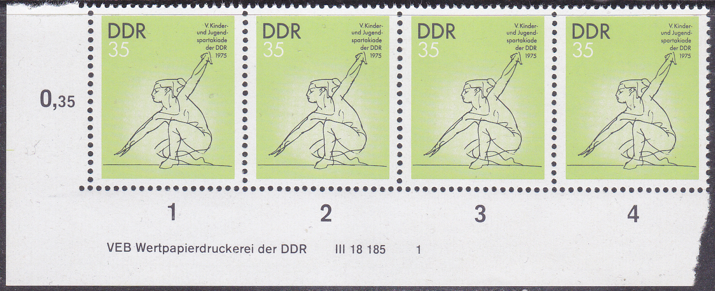 Unterrand mit Druckvermerk (MiNr 2068 DV) der Marke zu 35Pf aus der Serie "Kinder- und Jugendspartakiade" 1975 mit einer Turnerin am Schwebebalken. Dieser Druckvermerk geht über drei Marke.