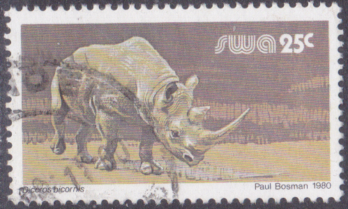 Ergänzend zu einem früheren Beitrag zeige ich die dort erwähnte bildgleiche Marke (MiNr 896 I A) mit dem Spitzmaulnashorn (Diceros bicornis) mit lateinischen Namen auf der Marke.
