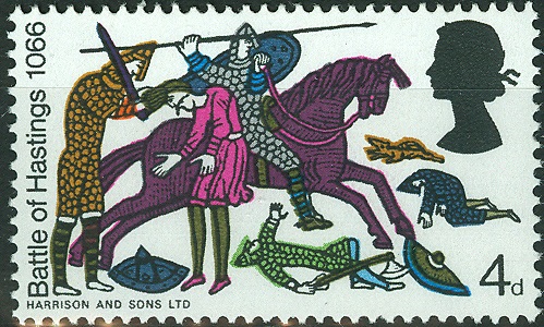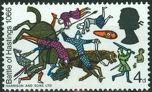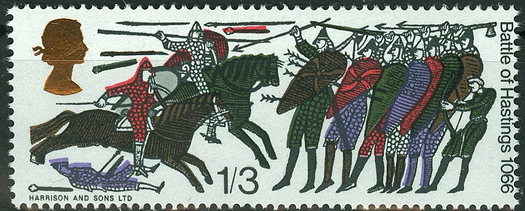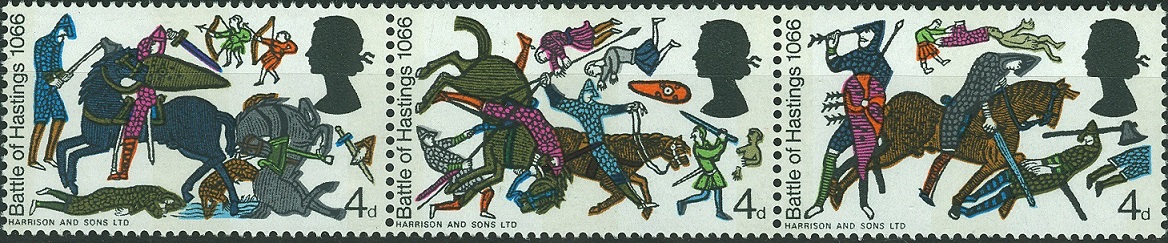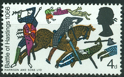 Durch den Sieg Wilhelm des Eroberers am 14.Oktober 1066 kam England unter normannische Herrschaft.1966, 900 Jahre später, brachte England eine Markenserie mit der bildlichen Darstellung der Invasion der Normannen heraus, die diesem Ereignis gewidmet war. Gedruckt nach den Motiven des berühmten Teppichs von Bayeux. Dort sieht man auf weißem Untergrund (lose gewebtes Leinen) Szenen, die mit farbiger Stickerei aneinandergereiht, eine fortlaufende Schilderung ergeben.