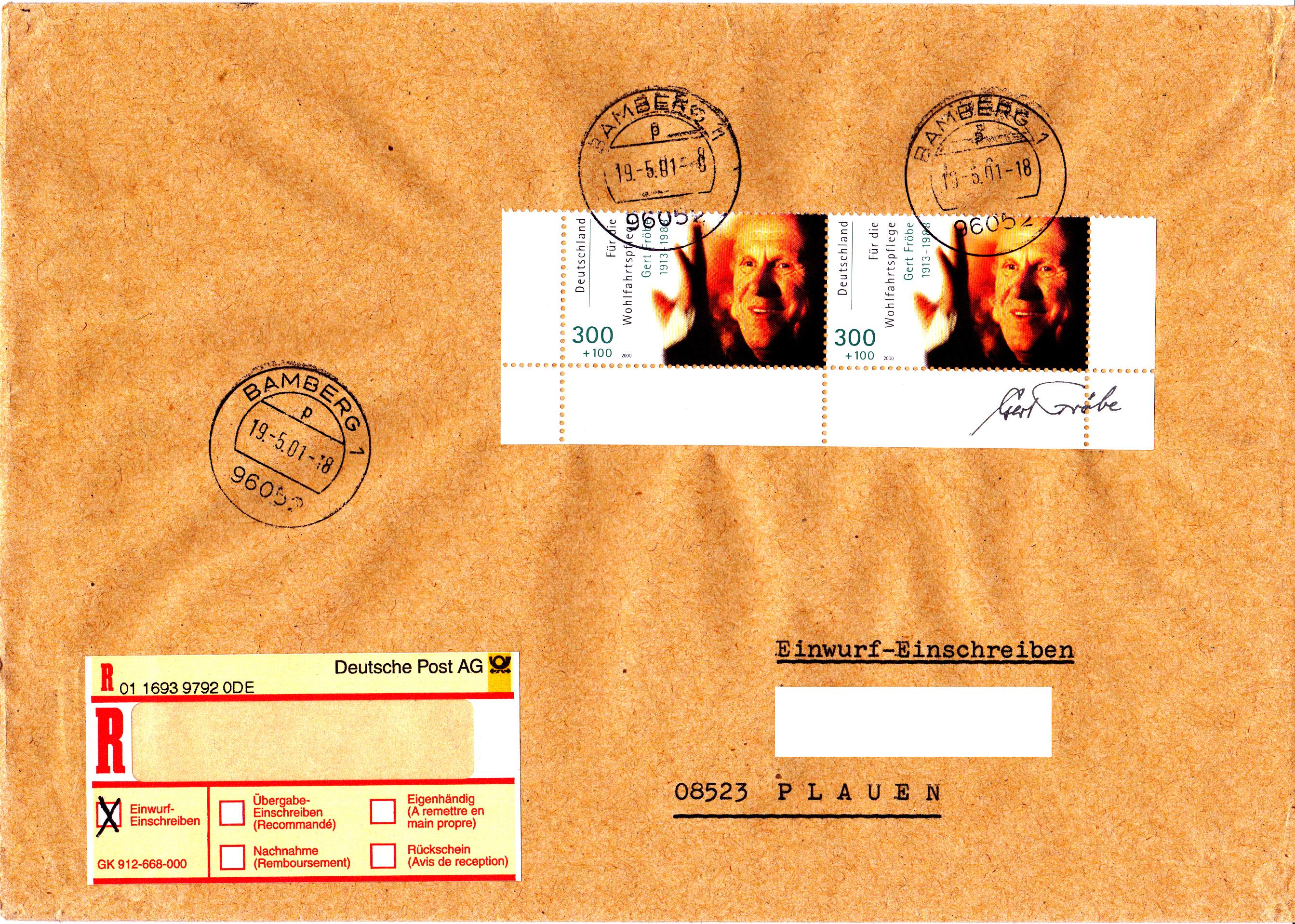 Paar vom unteren Bogenrand der 300 + 100 Pf-Marke aus der Wohlfahrtsmarkenserie von 2000 (MiNr 2147) mit dem Motiv "Gert Fröbe" portogerecht auf einem Einwurf-Einschreiben von 51 bis 500 g von Bamberg nach Plauen. Portoberechnung: Brief 300 Pf, Einwurf-Einschreiben 300 Pf zusammen 600 Pf.