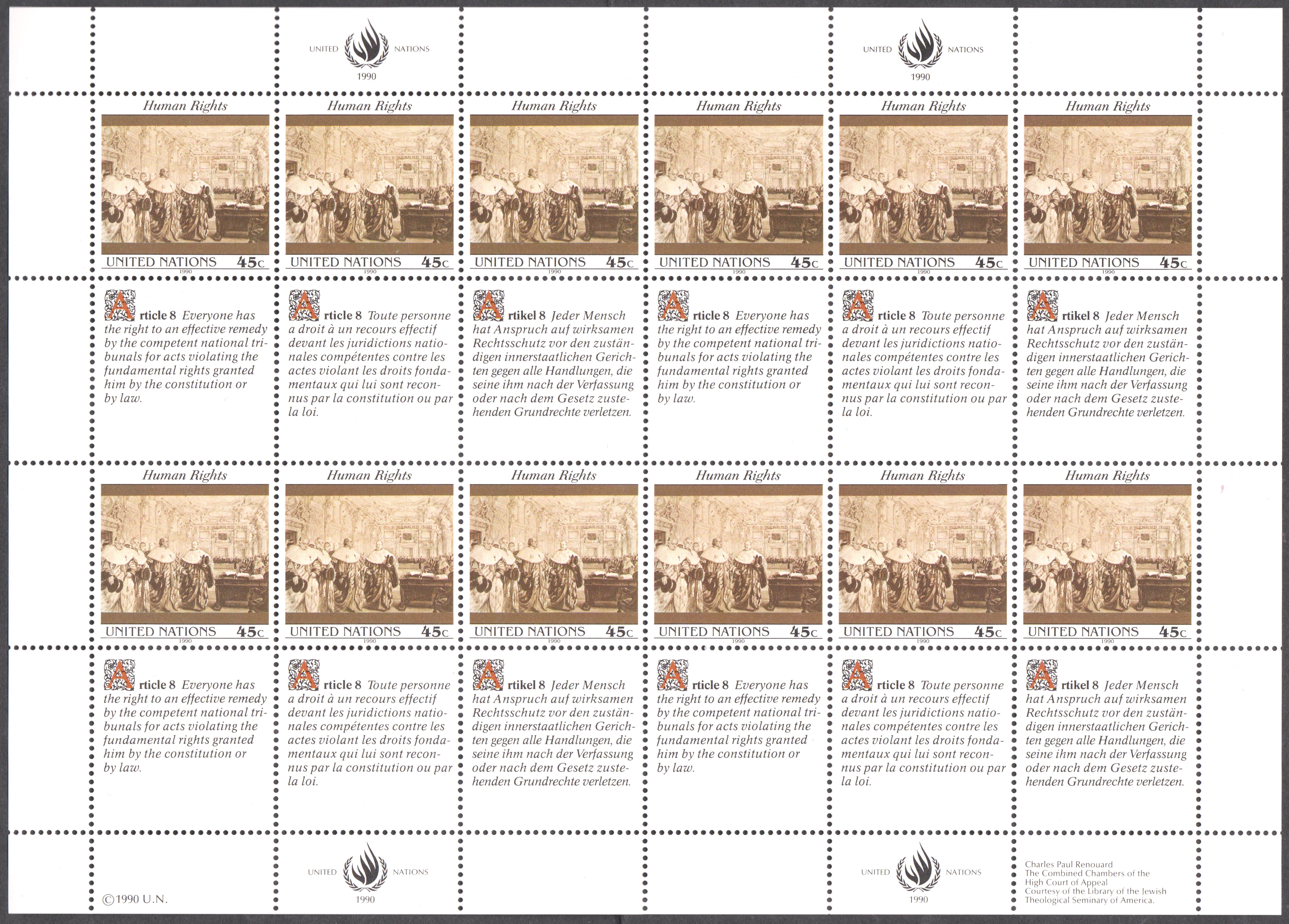 Die Zierfelder zu Vereinte Nationen - New York, MiNr. 607, zeigen Artikel 8 abwechselnd in englischer, französischer sowie deutscher Sprache: