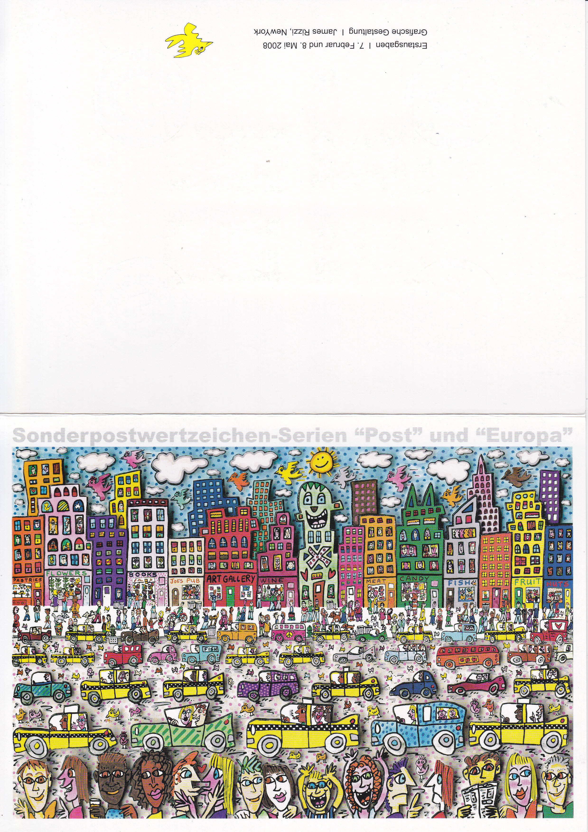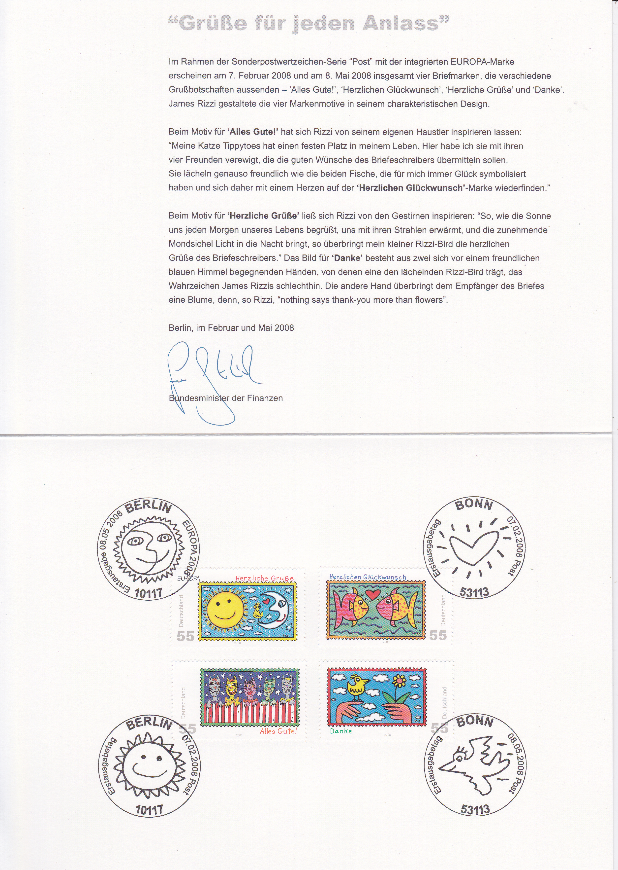 Farbige Ministerkarte des Bundesministers für Finanzen ungewöhnlichen Querformat mit je einer Marke der Serie "Post:Grußmarken" (MiNr 2644/2645 und 2663) und der Europamarke (MiNr 2662) und den jeweils dazu gehörenden Ersttagsstempel Bonn und Berlin. Ungewöhnlich ist auch, dass zwei Marken am 7.2.2008 und die beiden anderen Marke erstam8.5.2008 erschienen sind. Die Gemeinsamkeit der vier Marken liegt darin sie alle nach Entwürfen von James Rizzi gestaltet wurden.