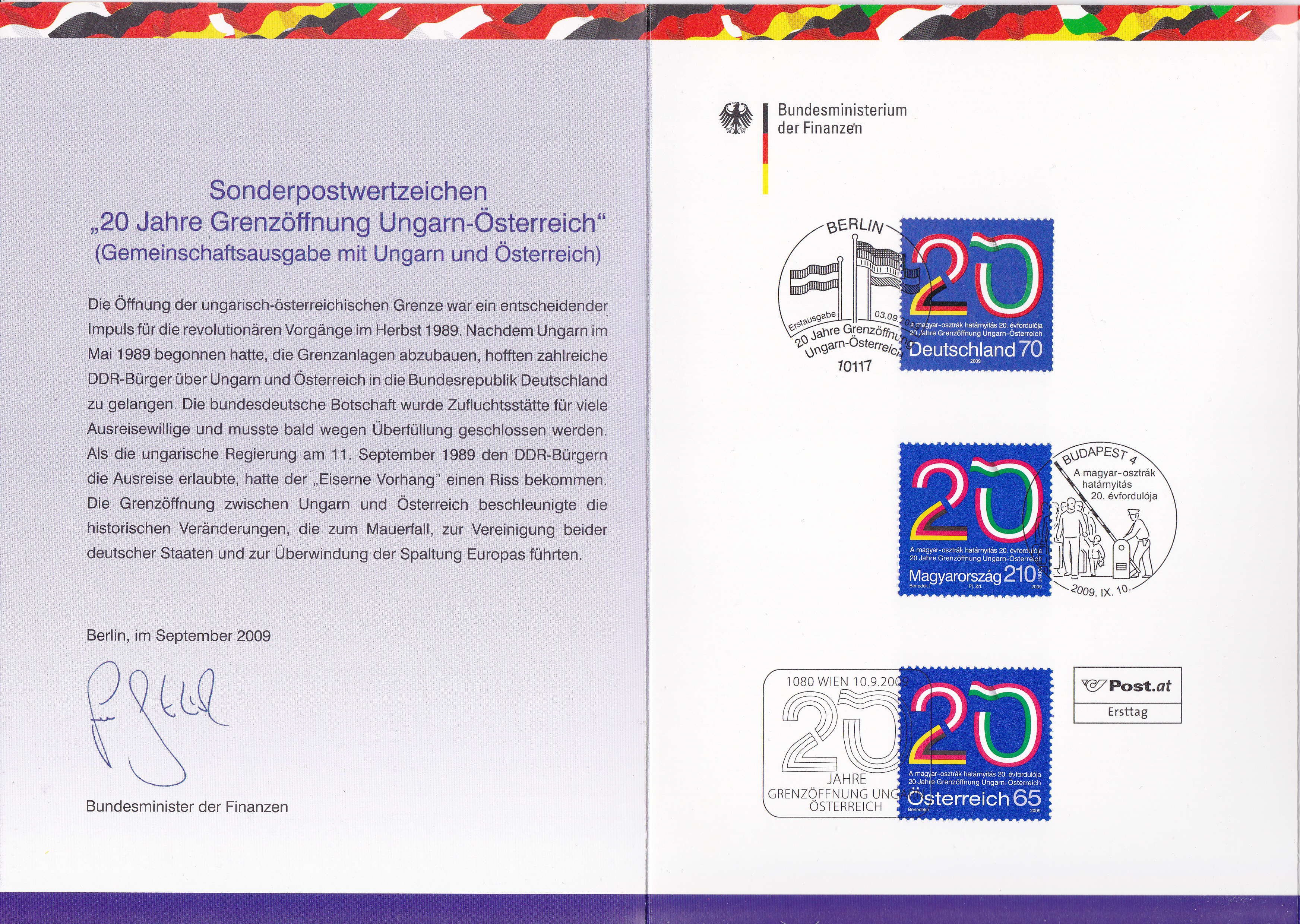 Farbige Ministerkarte mit je einer Marke "20 Jahre Grenzöffnung Ungarn-Österreich (Bund MiNr 2759, Ungarn MiNr 5383 und Österreich MiNr 2823) und den jeweiligen Ersttagsonderstempel Berlin, Budapest und Wien.
