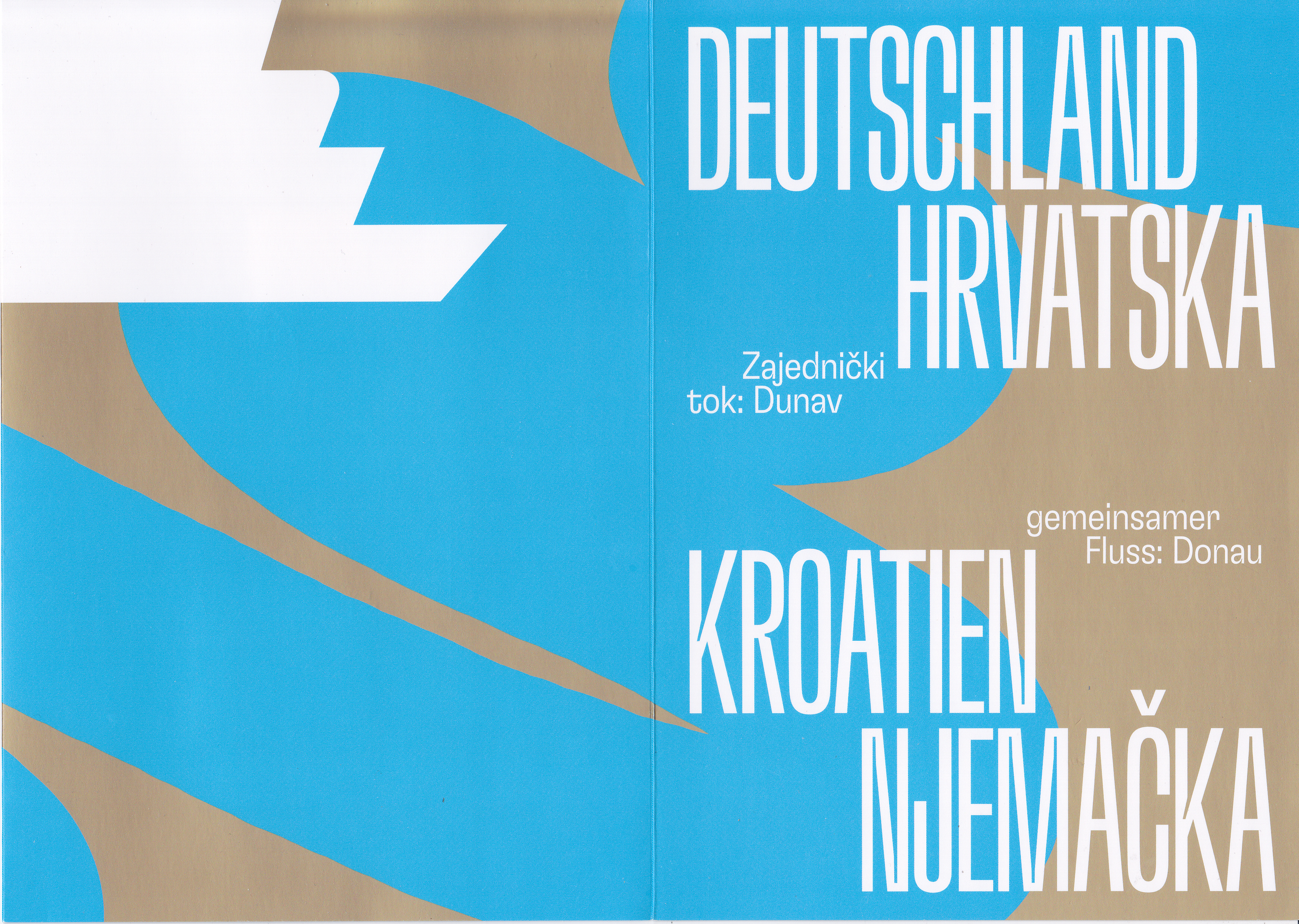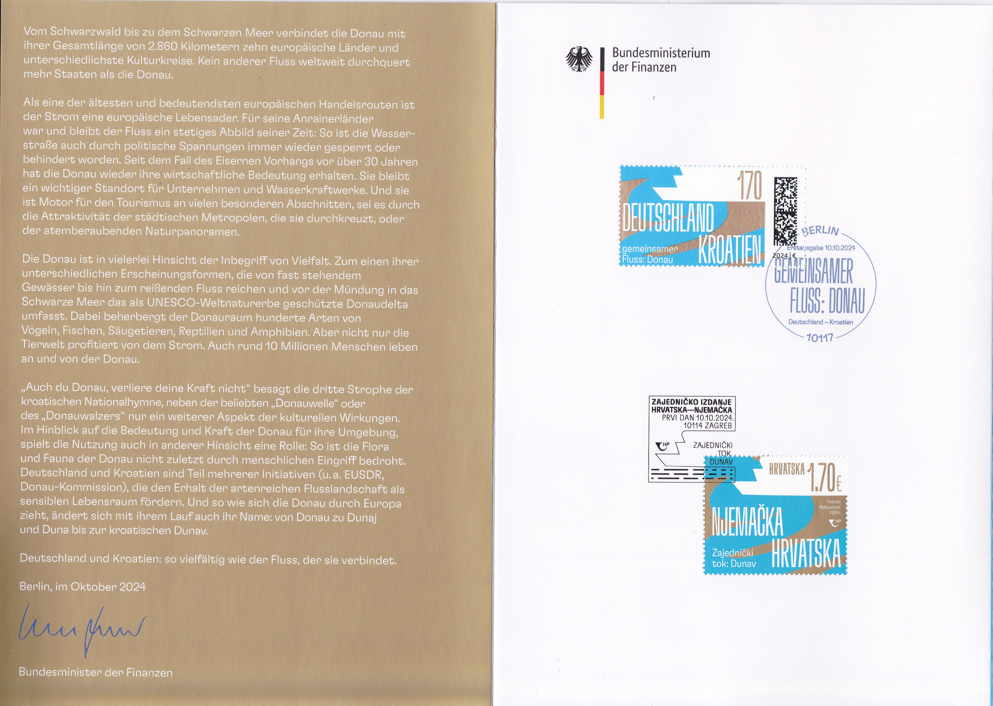 Farbige Ministerkarte mit je einer Marke "Donau, verbindender Fluss zwischen Deutschland und Kroatien" (Bund MiNr 3858 und Kroatien MiNr ??) und den jeweiligen Ersttagsonderstempel Berlin und Zagreb.