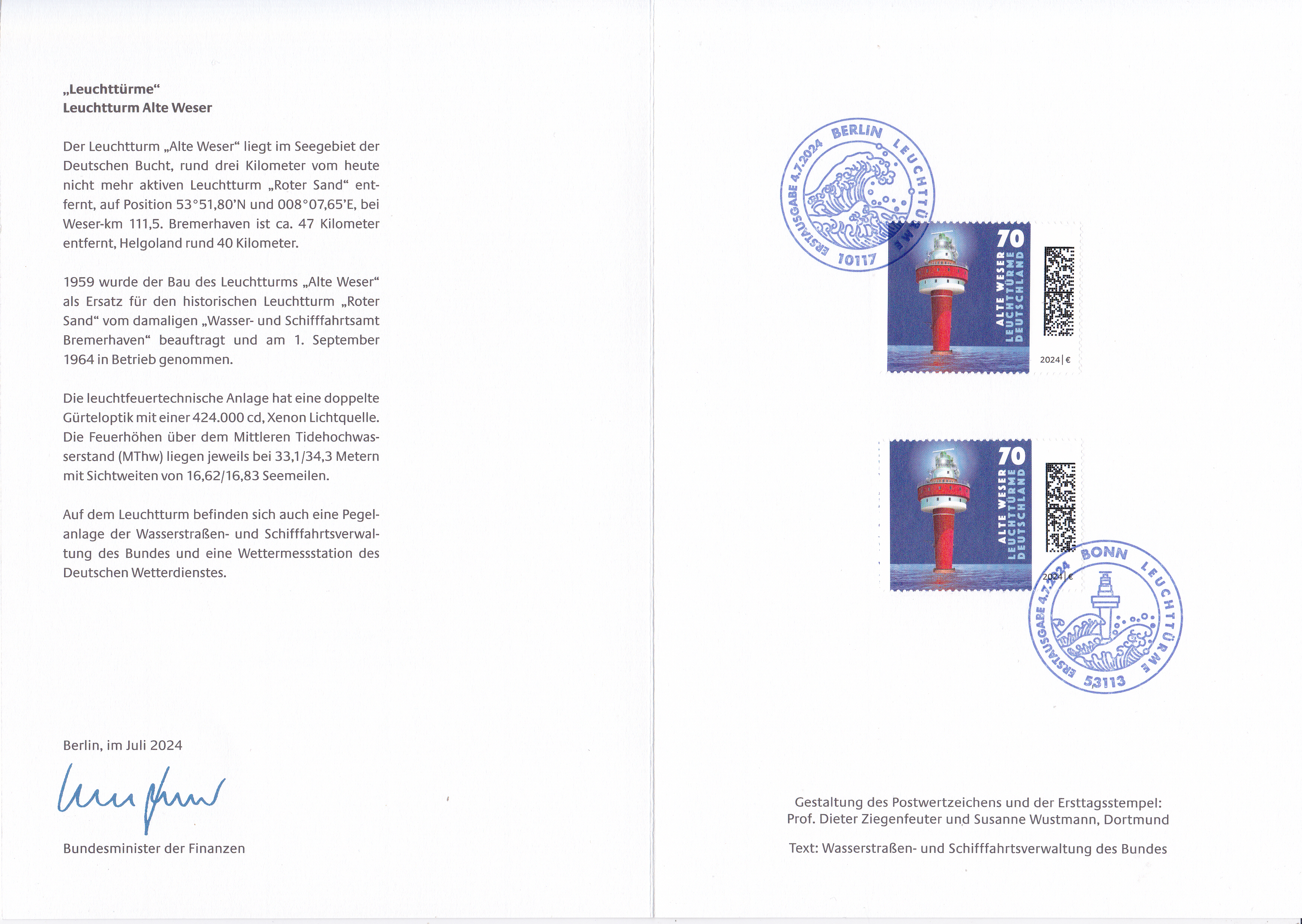 Ministerkarte des Bundesministers für Finanzen mit zwei Marken mit dem Motiv "Leuchtturm Alte Weser" aus der Serie "Leuchttürme" (MiNr 3840) und den beiden Ersttagsonderstempel Bonn und Berlin.