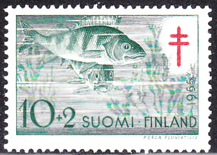Auf dieser Marke aus Finnland werden zwei Flussbarsche (Perca fluviatilis) gezeigt.